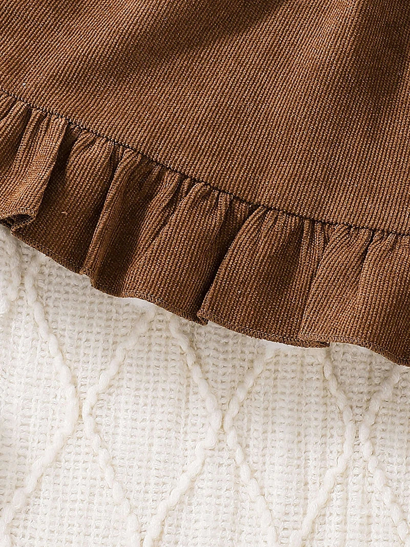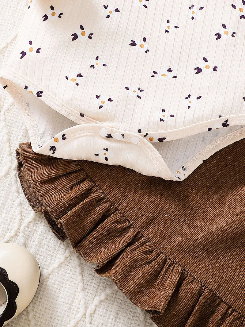 - **Design**: The set includes a cute romper with a lovely floral pattern and ruffled sleeves, adding a touch of sweetness. Paired with a brown corduroy suspender skirt featuring a frilled hem, it creates an adorable ensemble.