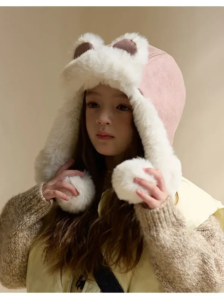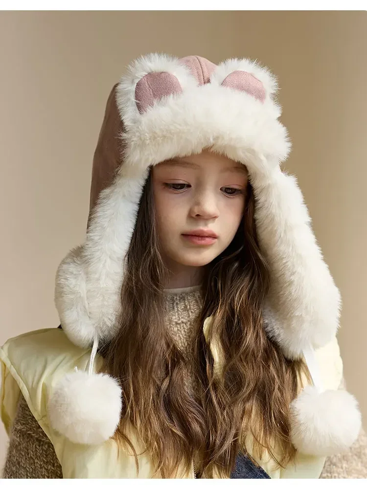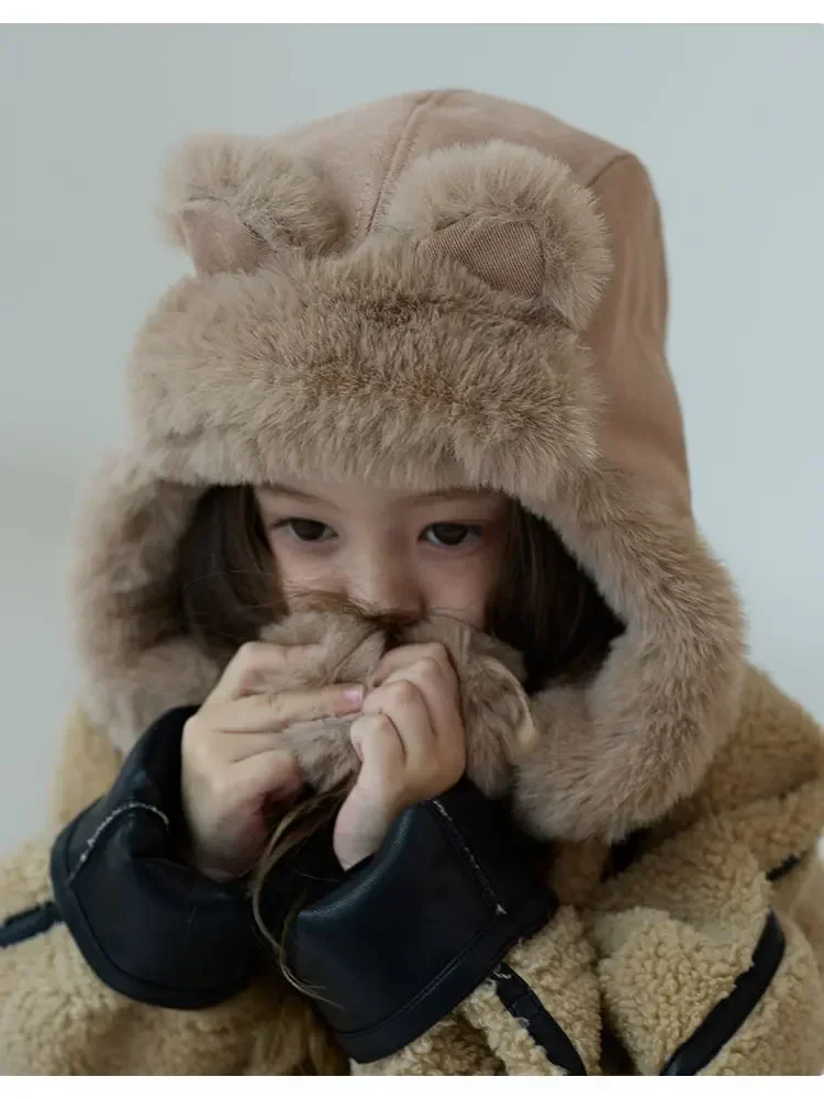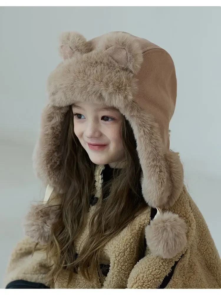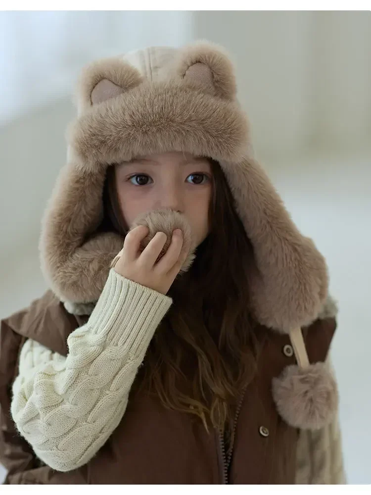 4-8Y New Winter Windproof Integrated Cap Scarf Soft Plush Warm Ear Protection Neck Cute Kids Beanie