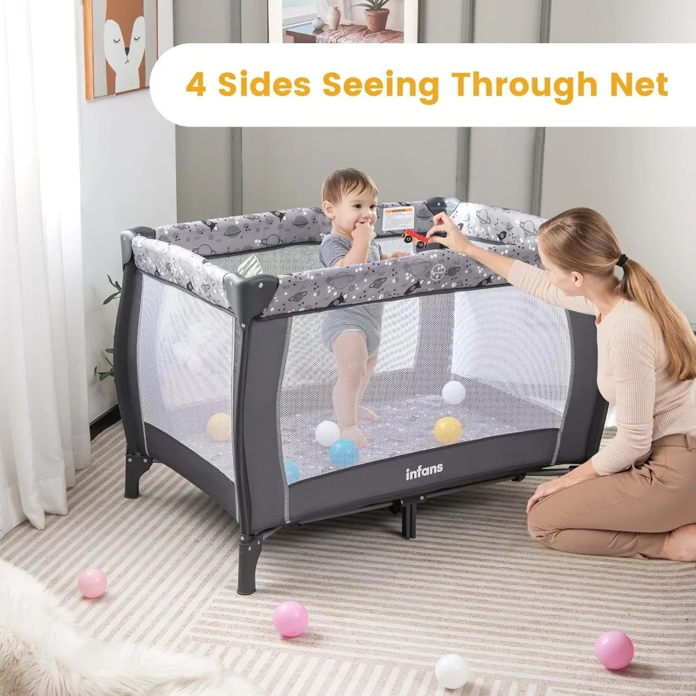 4 in 1 Pack and Play, Portable Travel Baby Playard with Bassinet, Changing Table, Canopy, Mosquito Net, Hanging Toys,