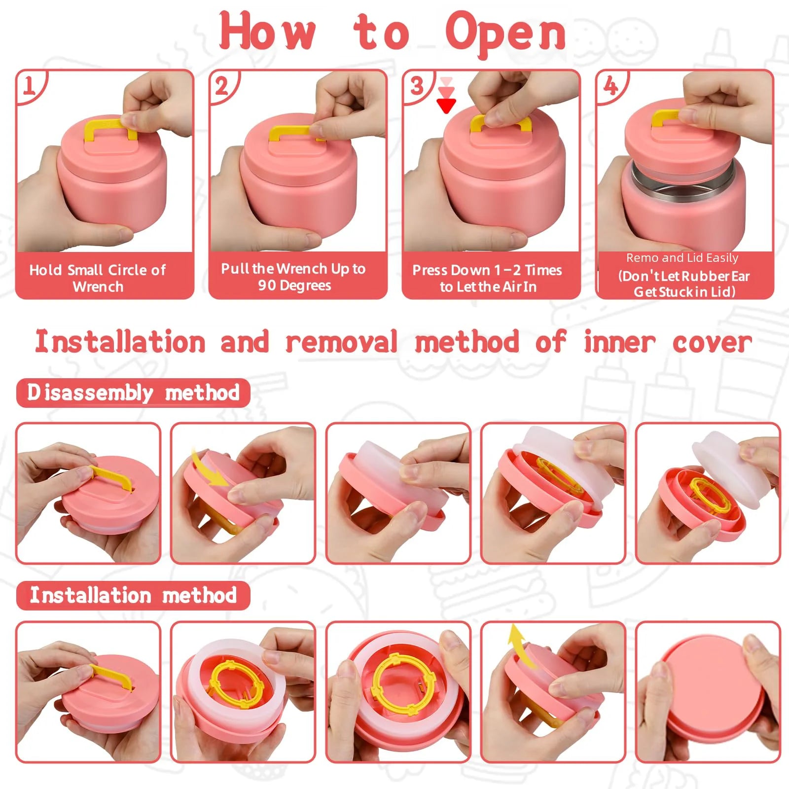 Portable Wrench Lid: Comes with a portable PP lid. Children can open it easily. How to Open Quickly: 1. Lay flat and hold small circle of wrench. 2. Pull the wrench up to 90 degrees. 3. Due to vacuum insulation, hold the wrench and press down 1-2 times to let the air In. 4. Remove lid easily. (Note: Don't let the internal rubber stopper get stuck in the lid).