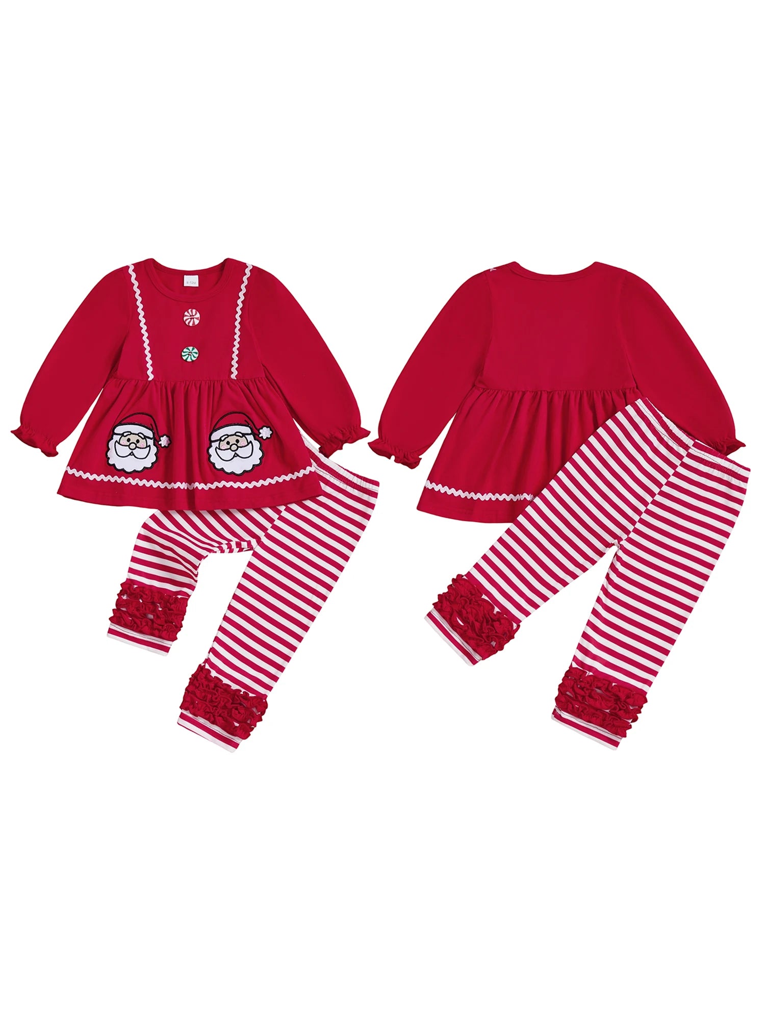 Toddler Baby Girls Clothing Set Fashionable Christmas Long Sleeve Santa Embroidery Tops with Striped Pants 2 Pcs Outfit