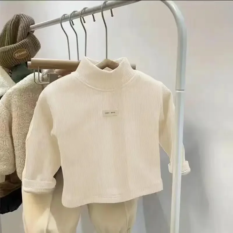 Autumn Winter Unisex Children Velvet T-Shirt Solid Warm Half High Collar Long Sleeve Base Shirt