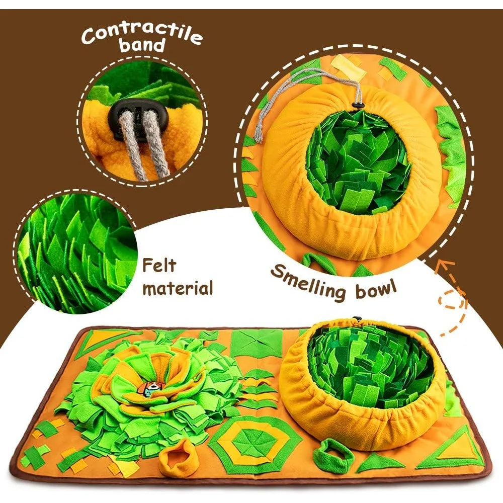 - [FUNNY TREAT FEEDING GAME]: The dog feeding mat has a big flower with 2 layers of orange petals and a big green messy grass for one or two dogs use at the same time. It can hide large food chunks and dog treat easily. AWOOF Pet Snuffle Mat has a squeaker under the logo and 3 pieces crinkle paper randomly place in the petal to attracts dog's attention and provide more fun.