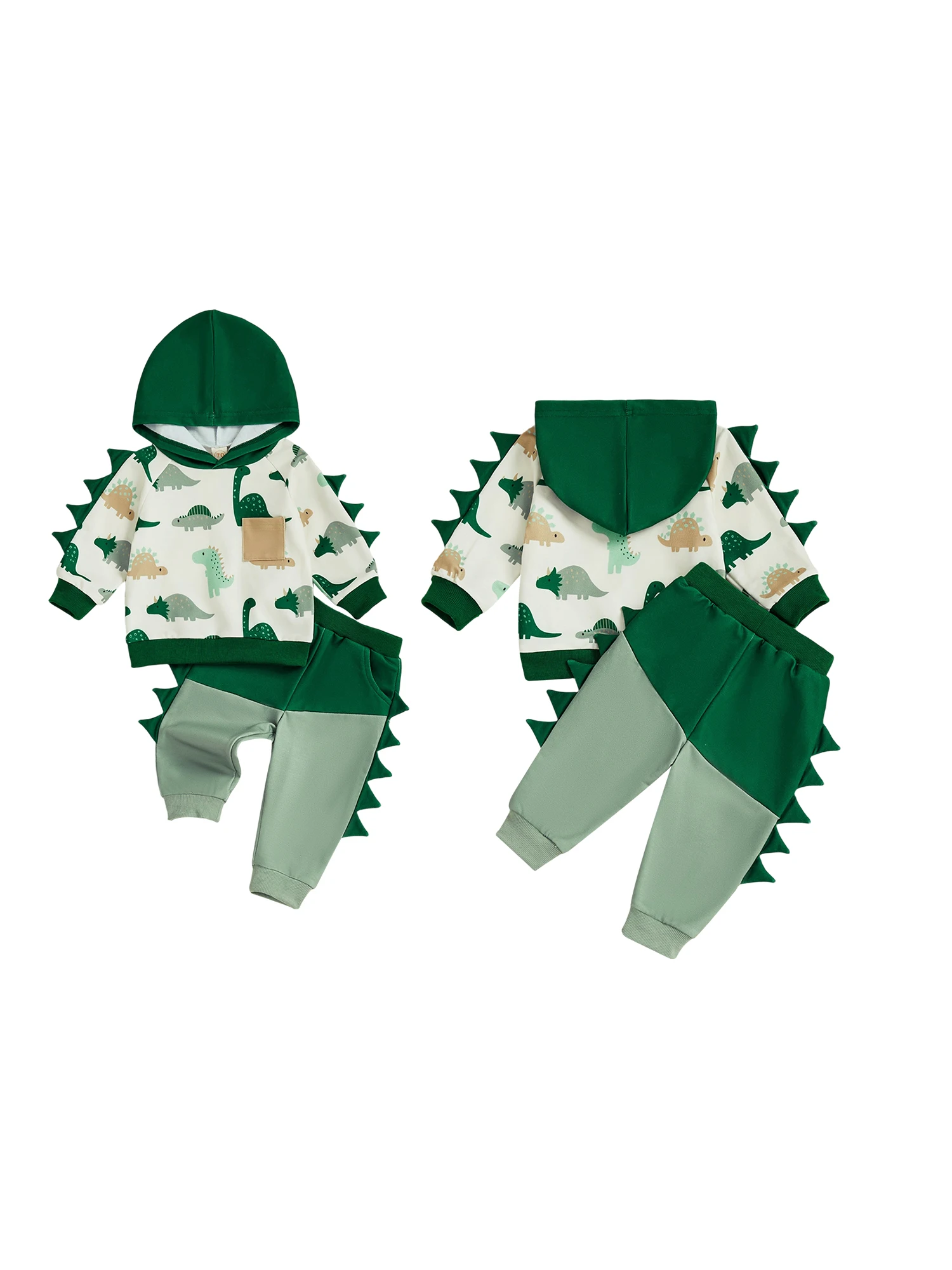 Baby Boy Autumn Clothes Cartoon Dino Pattern Hooded Sweatshirt Stretchy Jogger Pants 2 Piece Suit