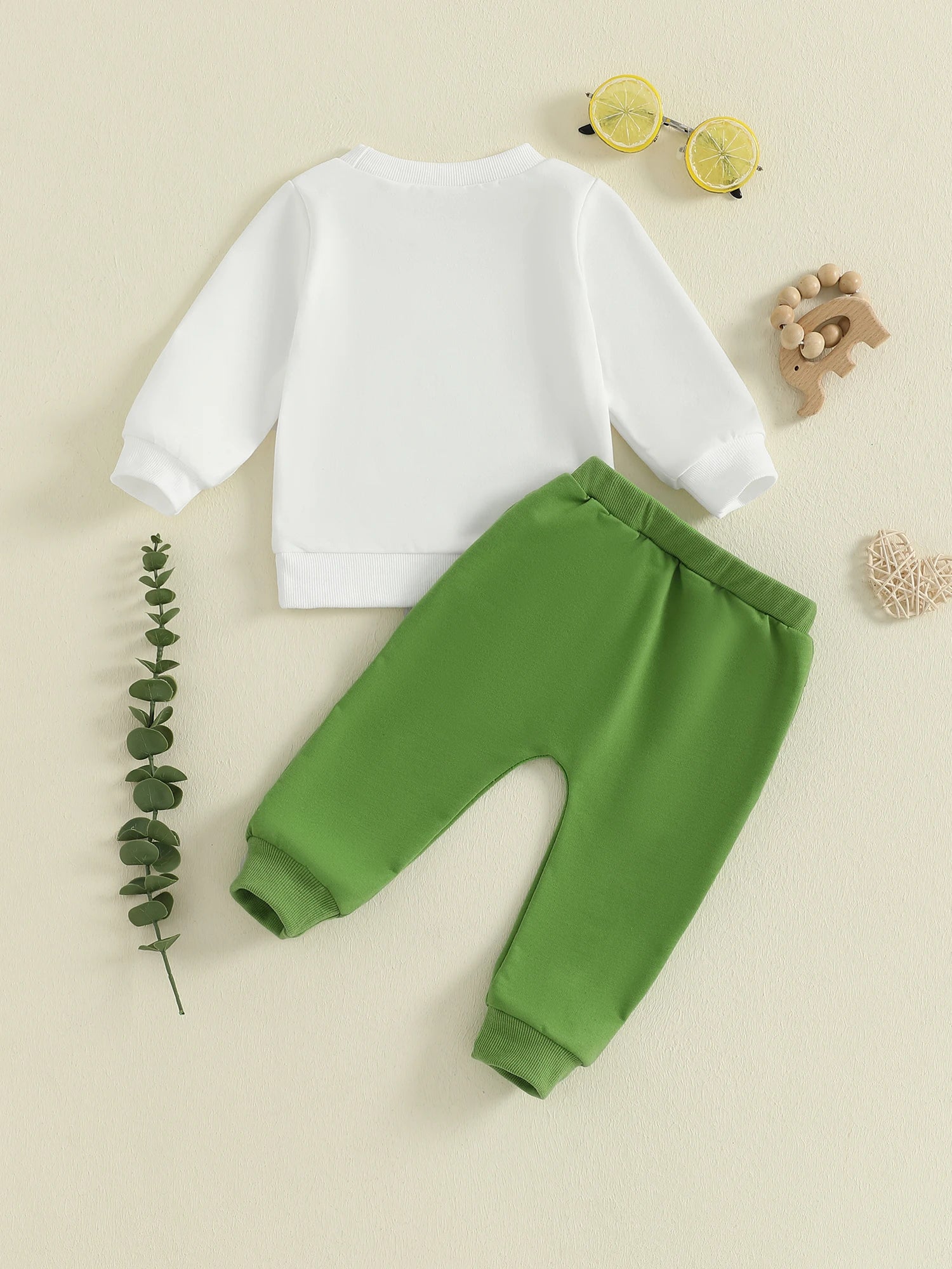 Toddler Boy Fall Outfits Dinosaur Letter Print Long Sleeve Round Neck Pullover + Elastic Waist Solid Pants 2 Pcs Set