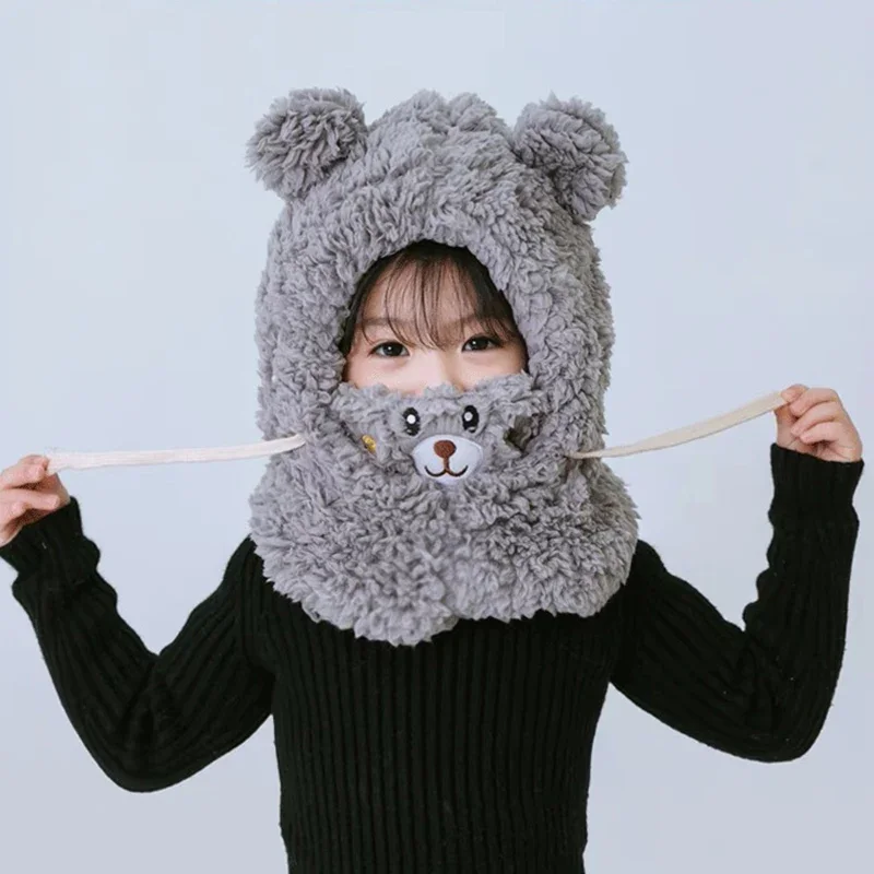 Children's Winter Hat Neck One - Piece Plush Cap with Cute Bear Design, Ear - Protection & Face Cover, for Boys & Girls