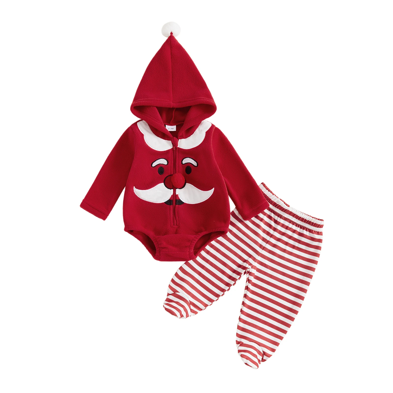Baby Christmas Outfit, Long Sleeve Santa Claus Hooded Romper with Striped Pants for Girls Boys
