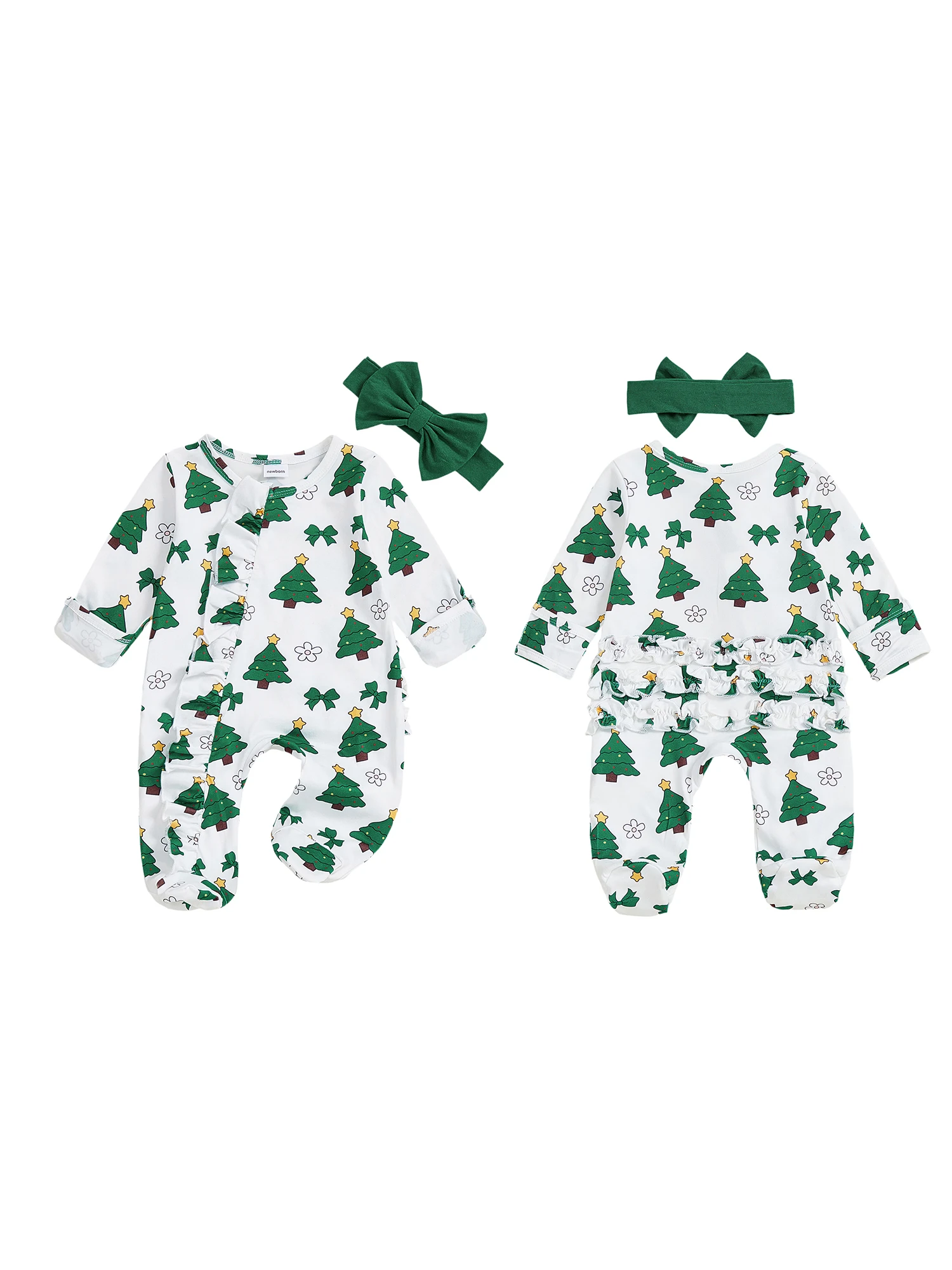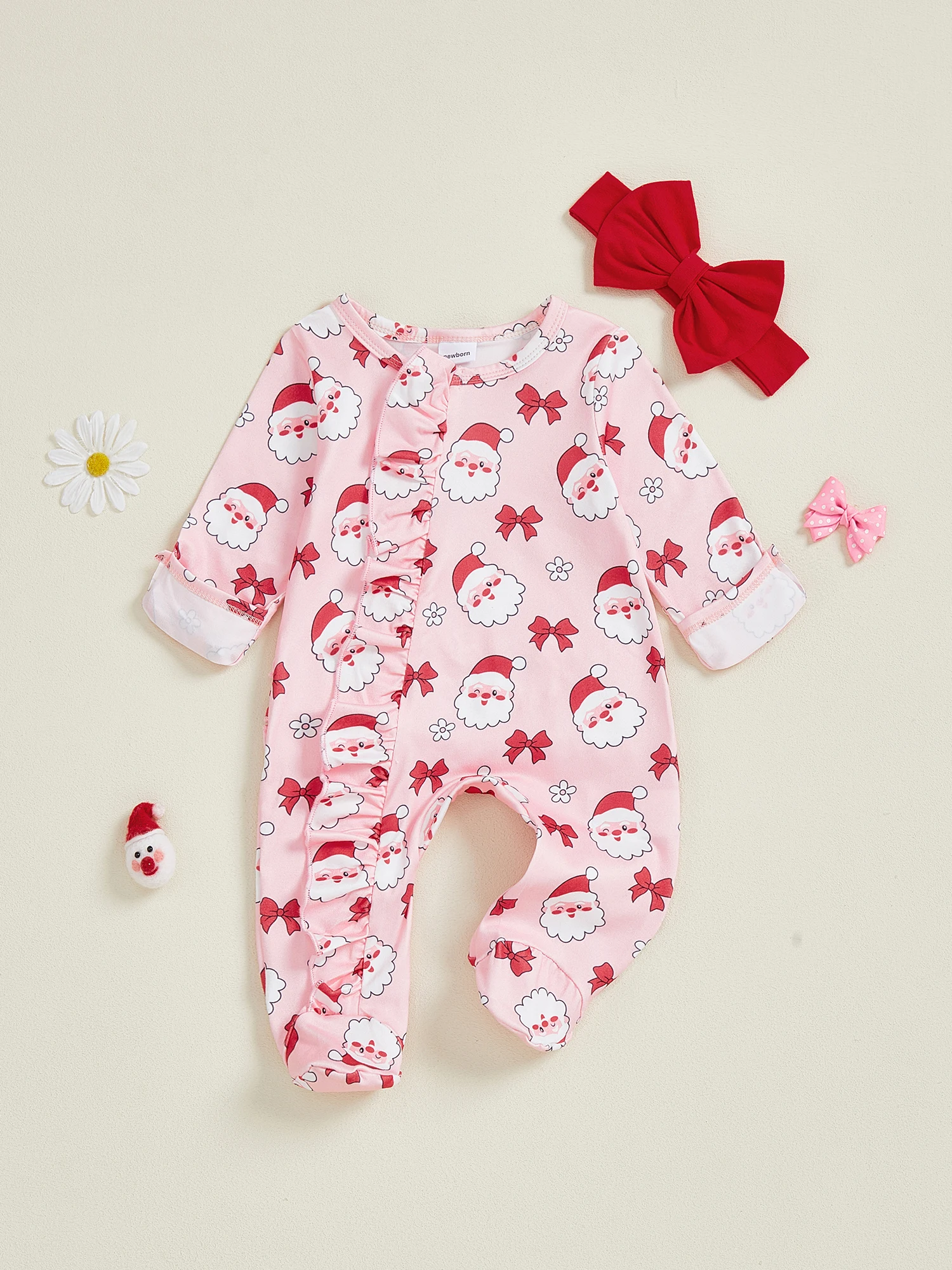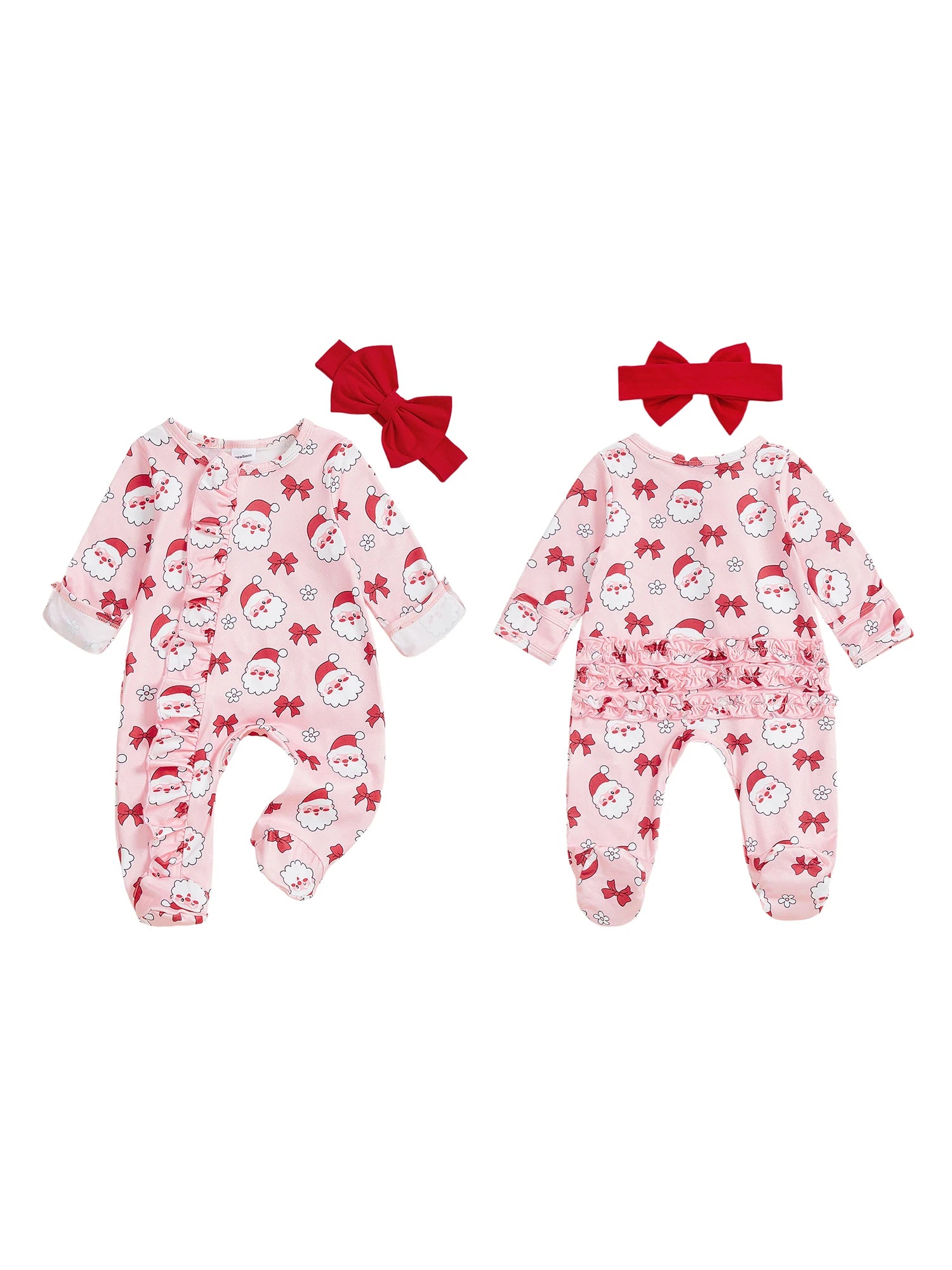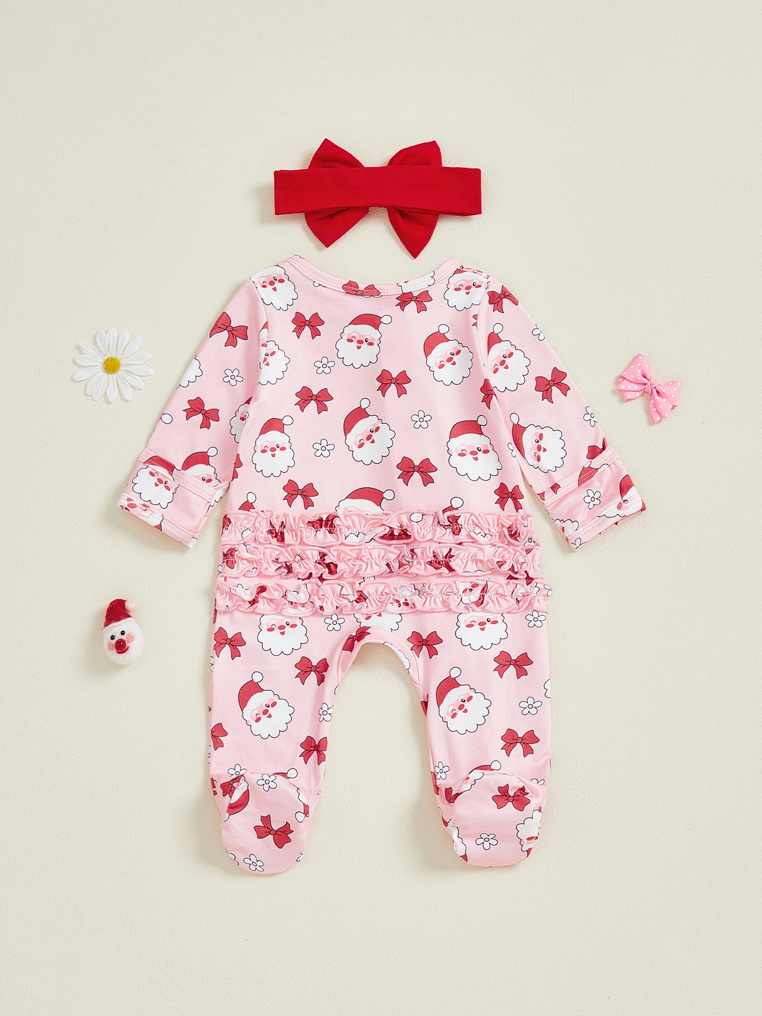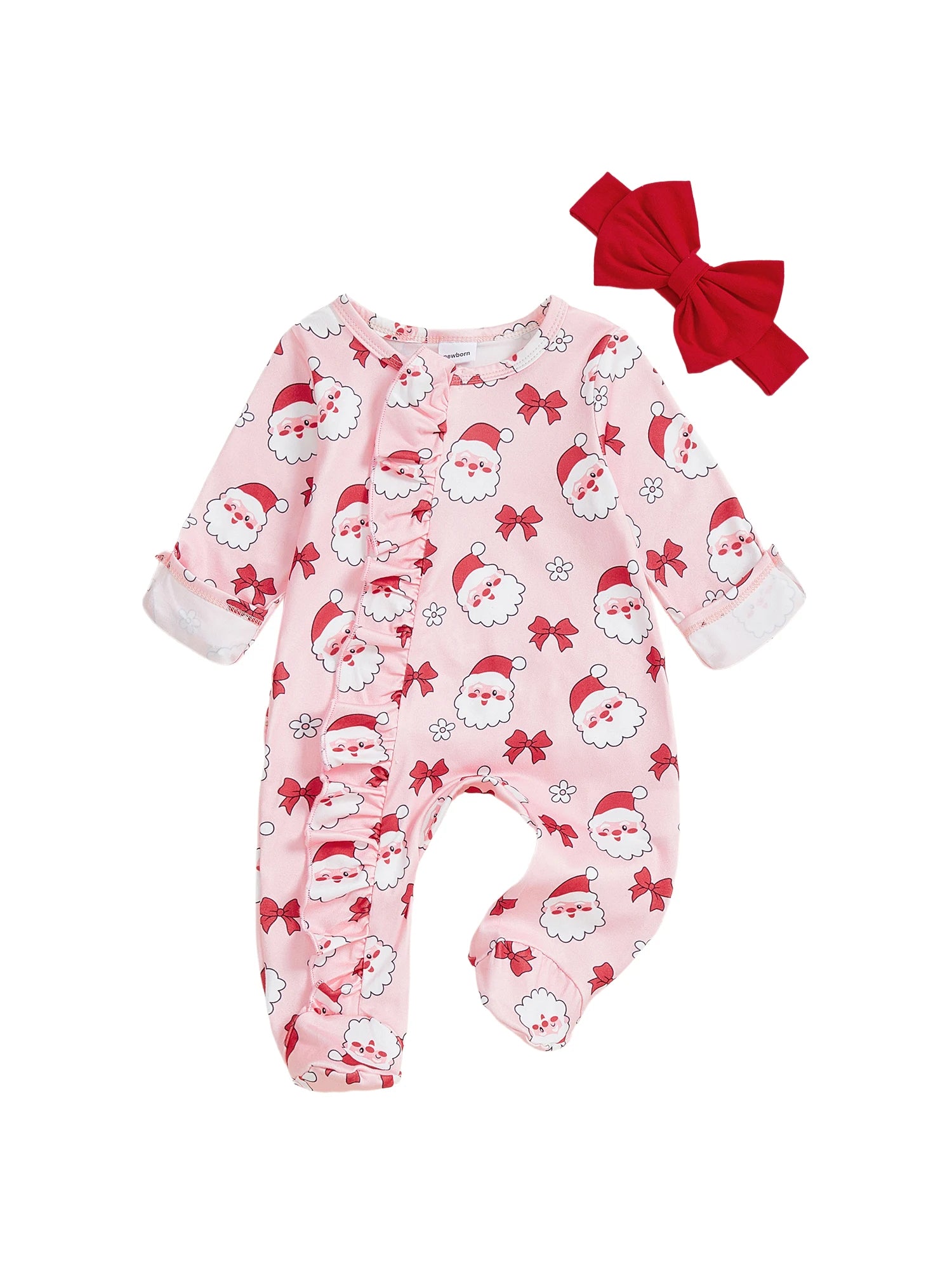 Newborn Baby Girl Christmas Romper Santa Print Long Sleeve Zip Up Footed Jumpsuit with Bow Headband