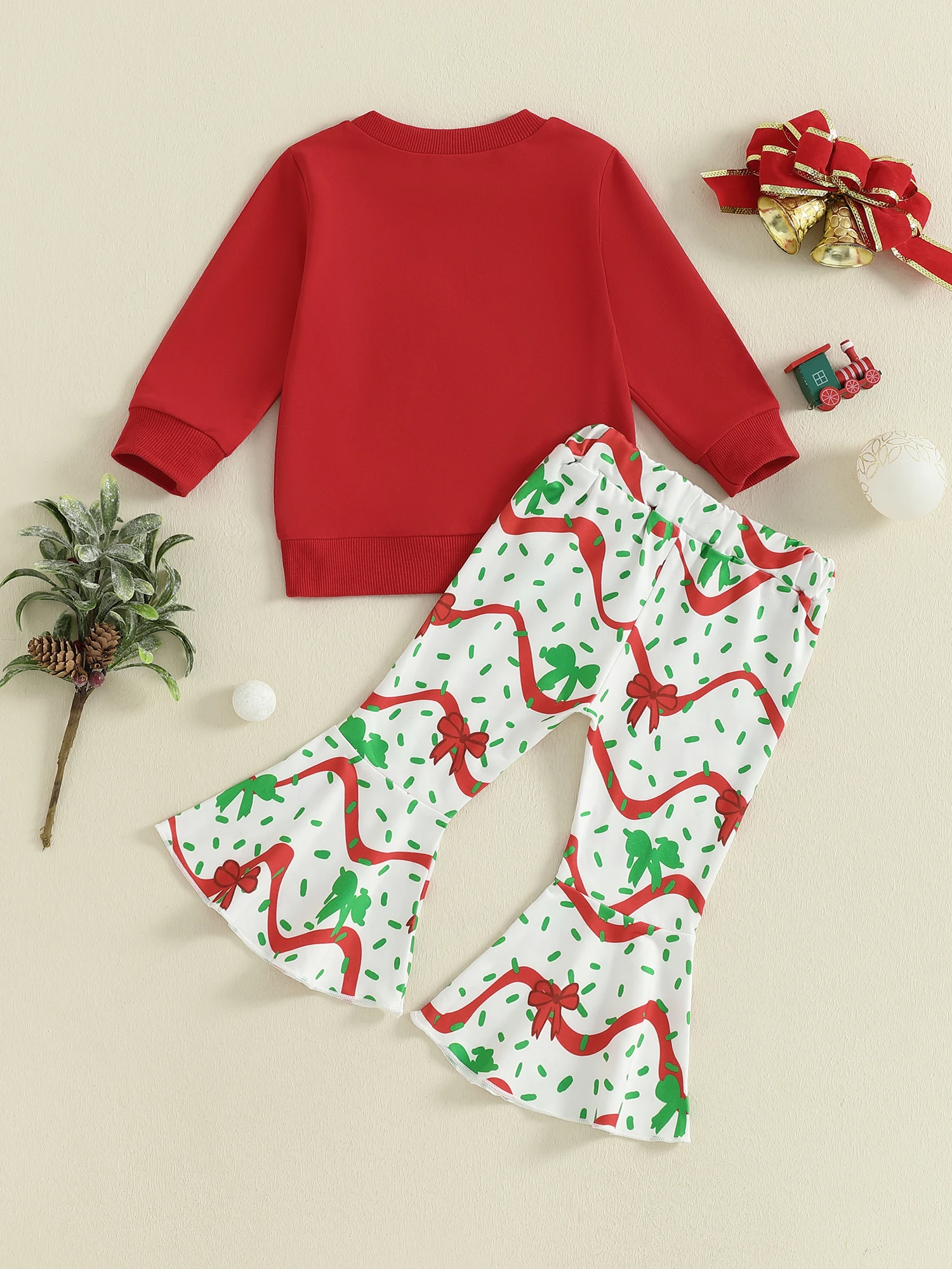 Toddler Girl Fall Outfits Bow Embroidery Long Sleeve Round Neck Pullover + Elastic Waist Flare Pants 2 Pcs Set