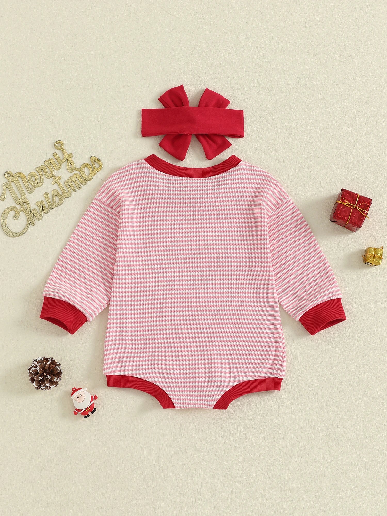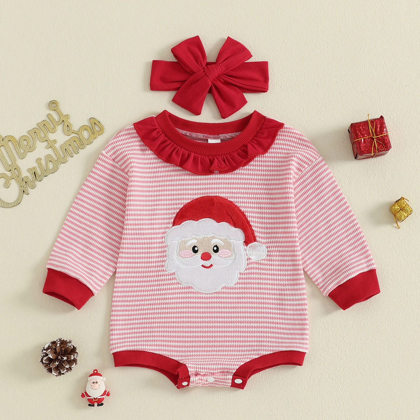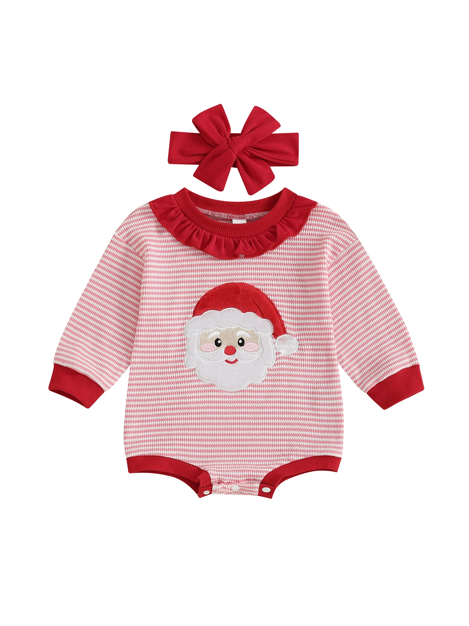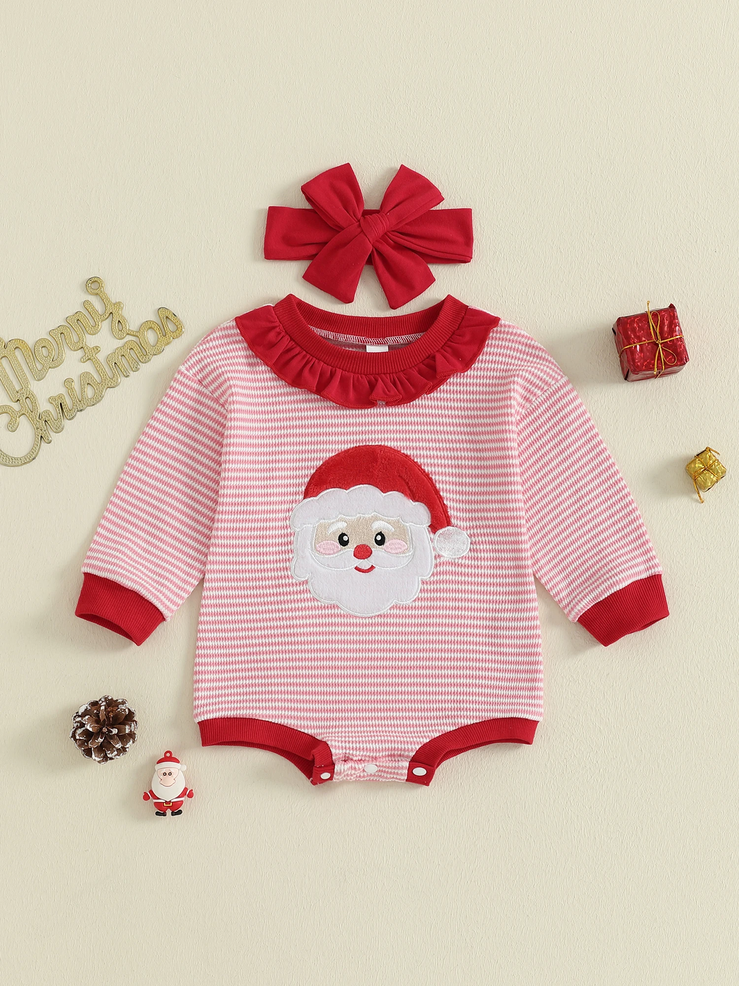 Newborn Girl Romper Christmas Long Sleeve Stripe Print Santa Claus Embroidery Jumpsuit with Headband Set Fall Outfit
