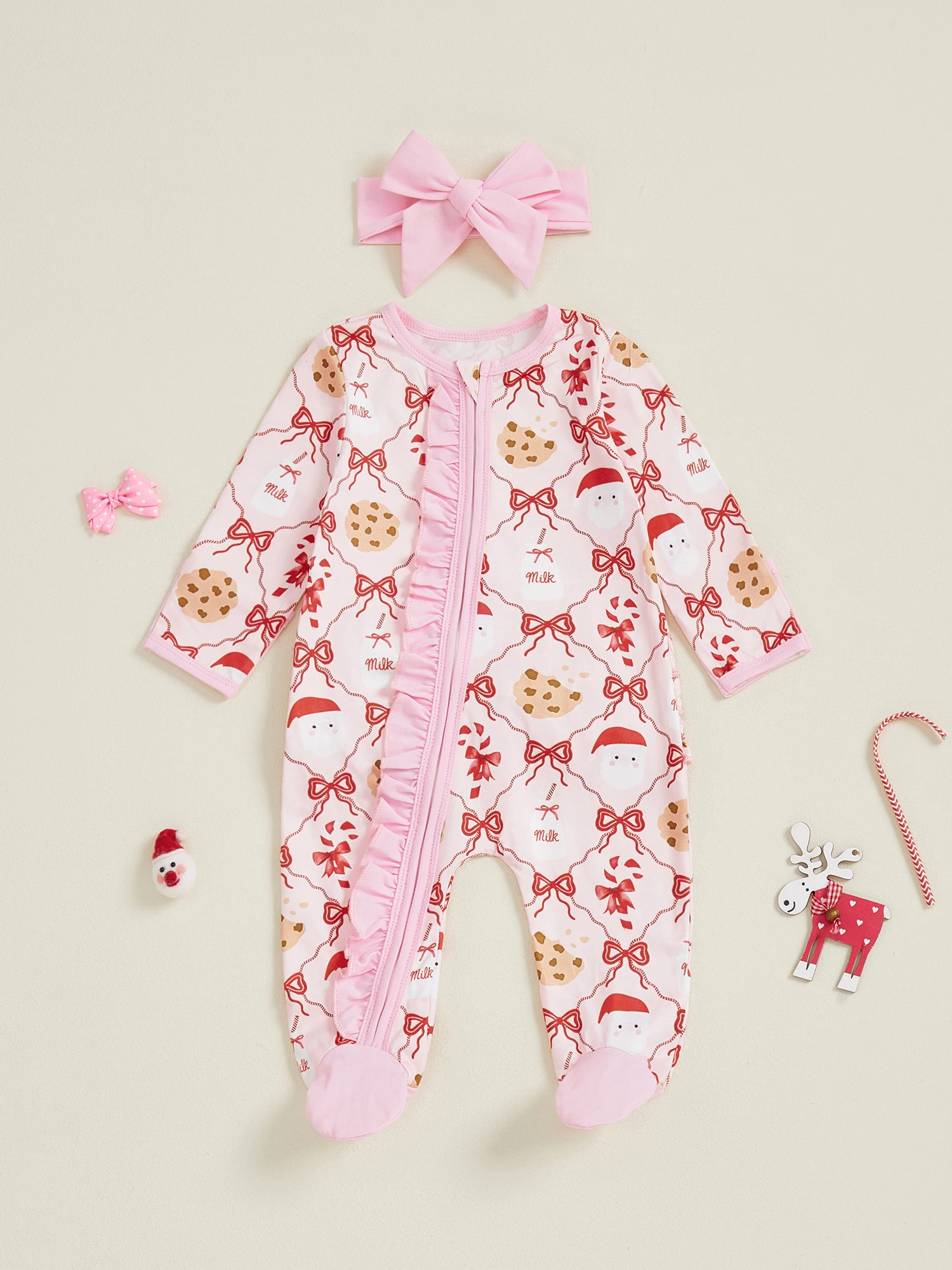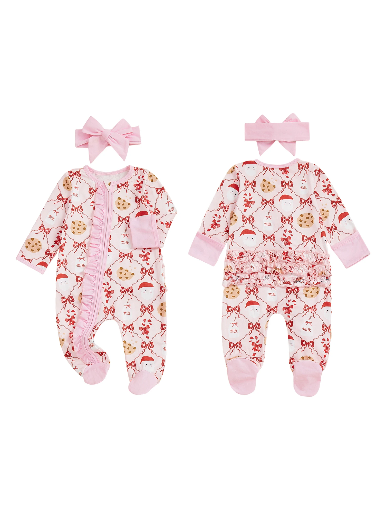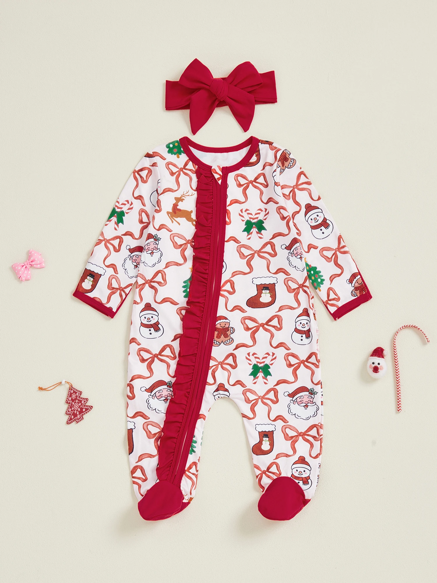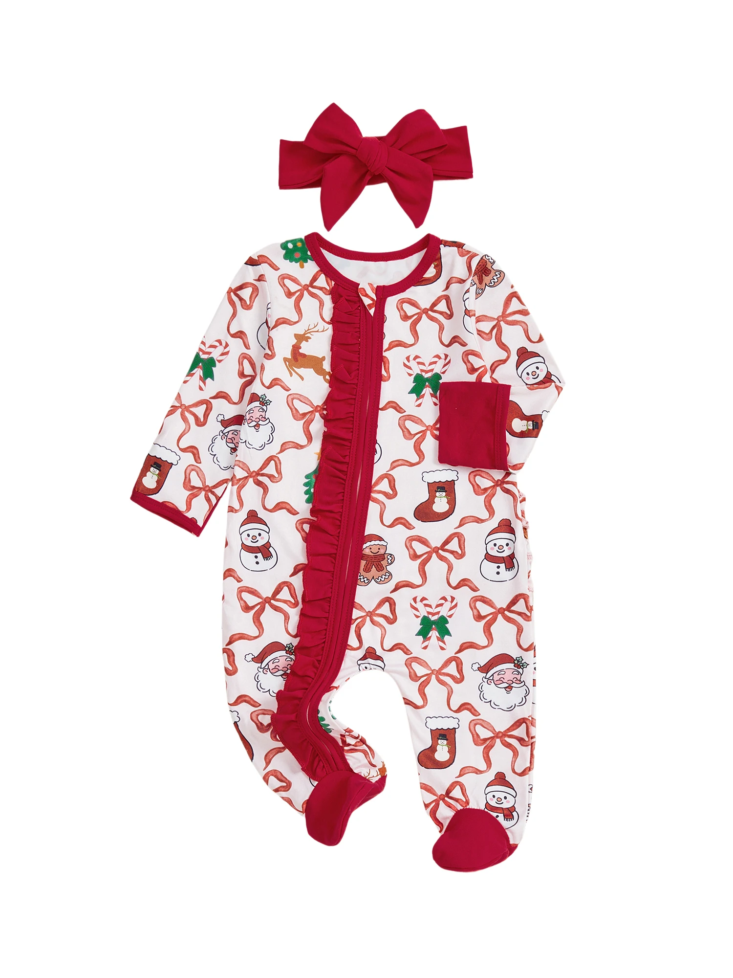 Newborn Girl Christmas Romper Bow Print Long Sleeve Zip Up Round Neck Footed Jumpsuit with Headband