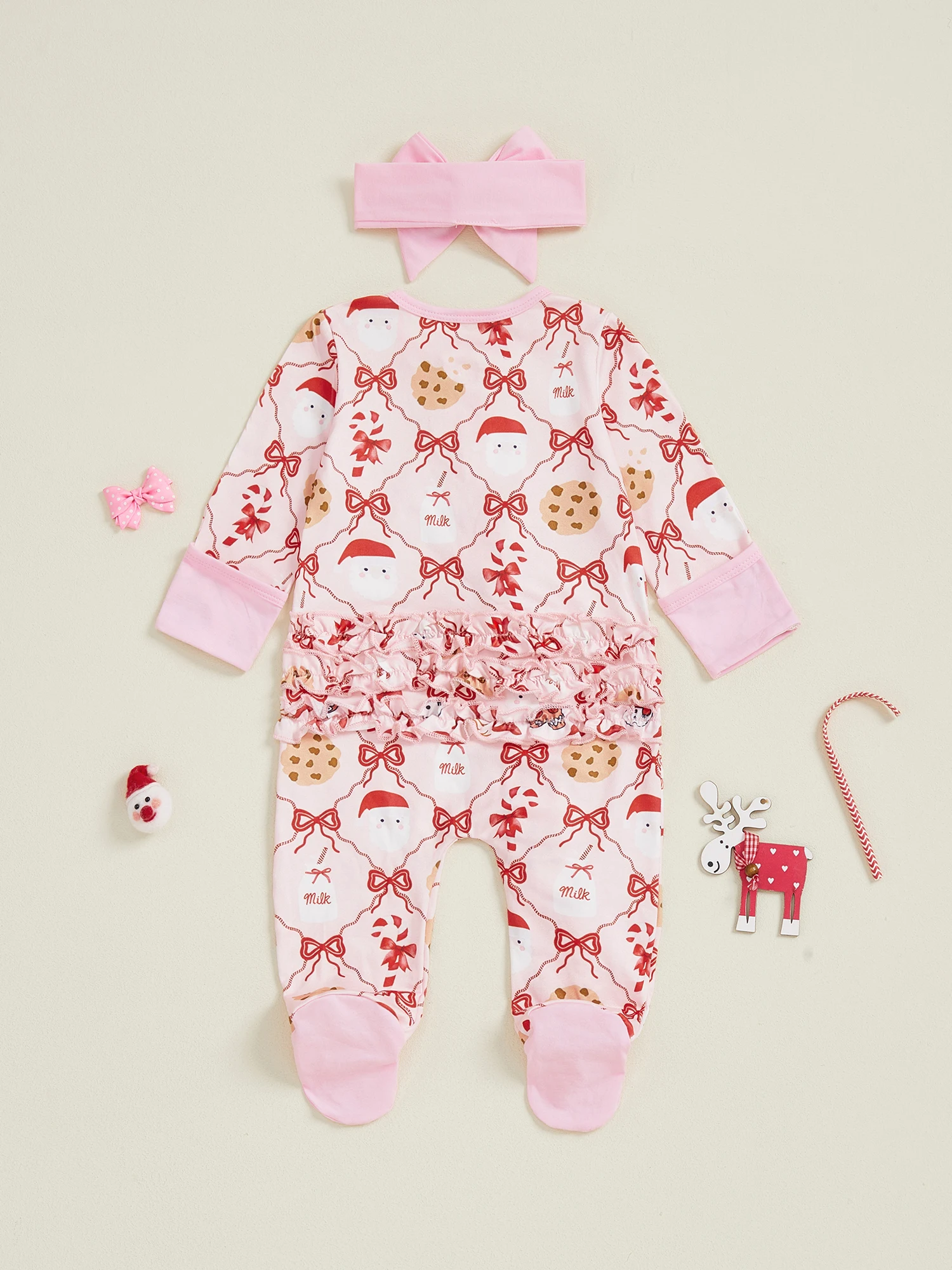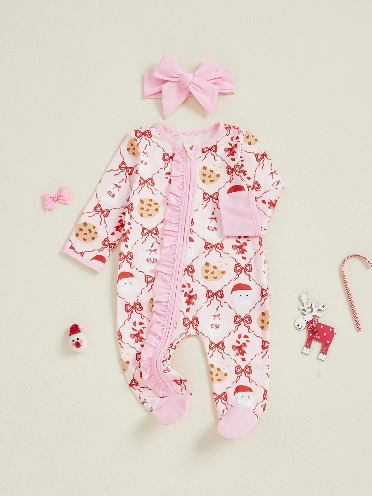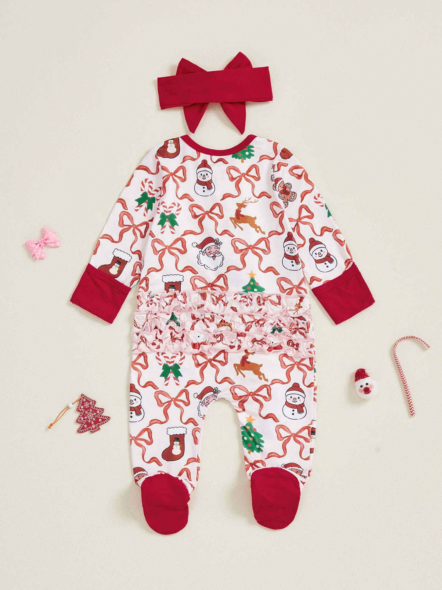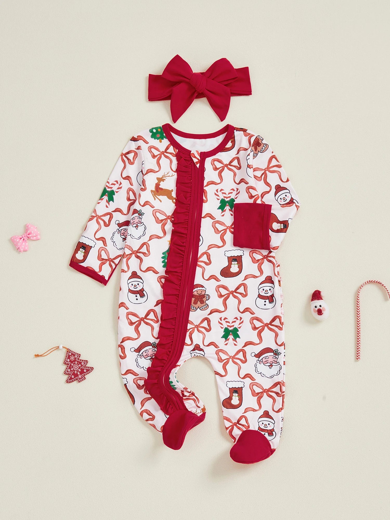 Newborn Girl Christmas Romper Bow Print Long Sleeve Zip Up Round Neck Footed Jumpsuit with Headband