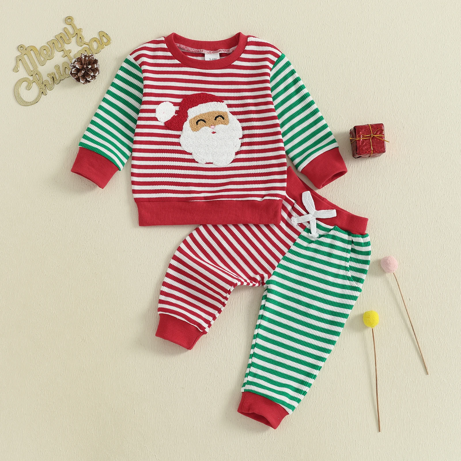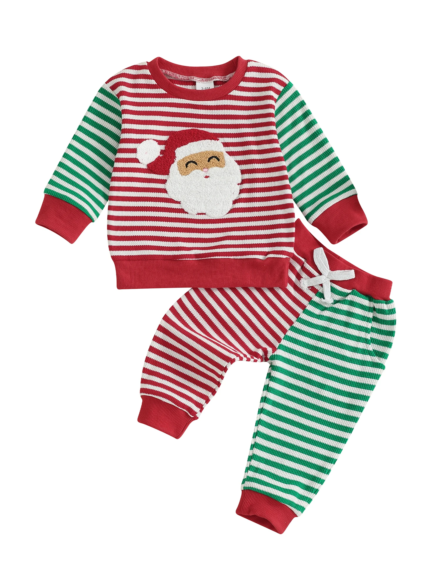 Toddler Baby Fall Striped Set Santa Claus Embroidery Long Sleeve Round Neck Pullover Bow Pants with Pocket 2 Pcs Outfit