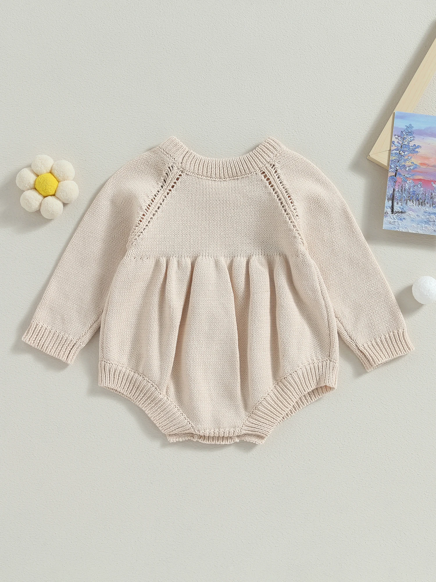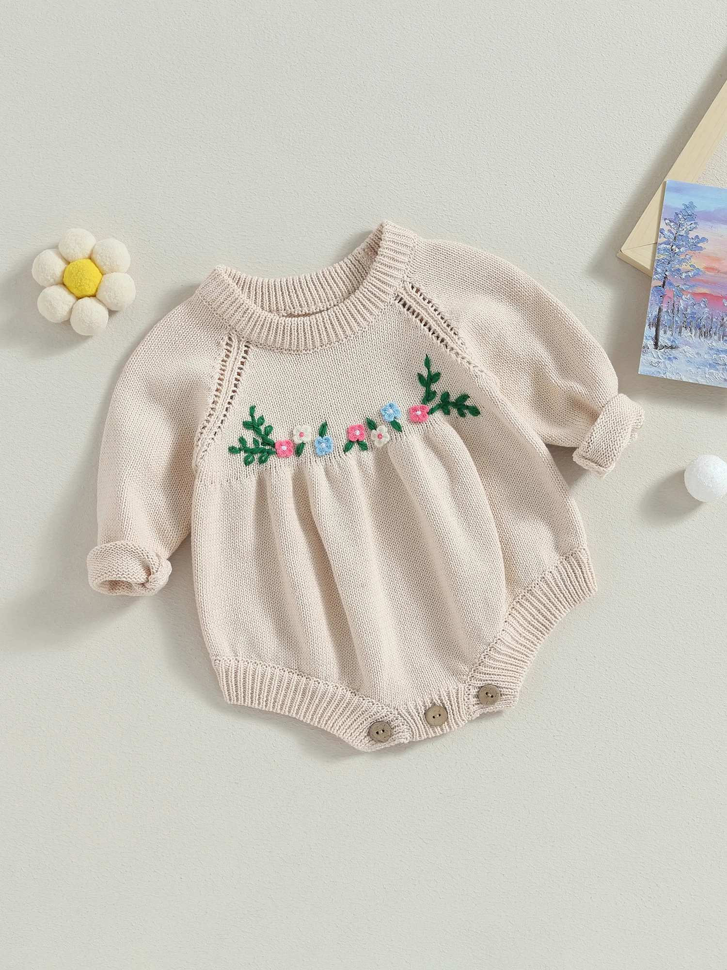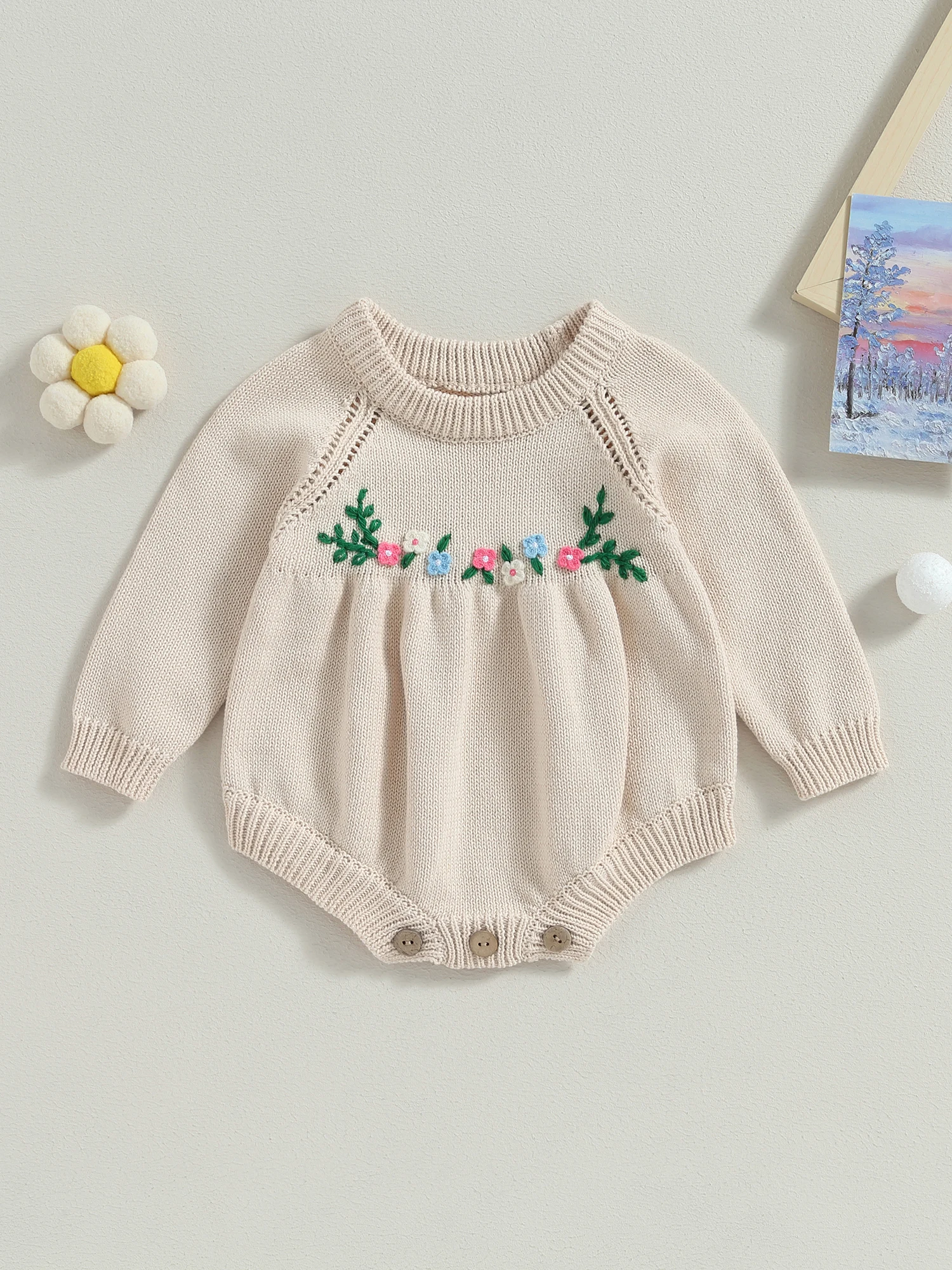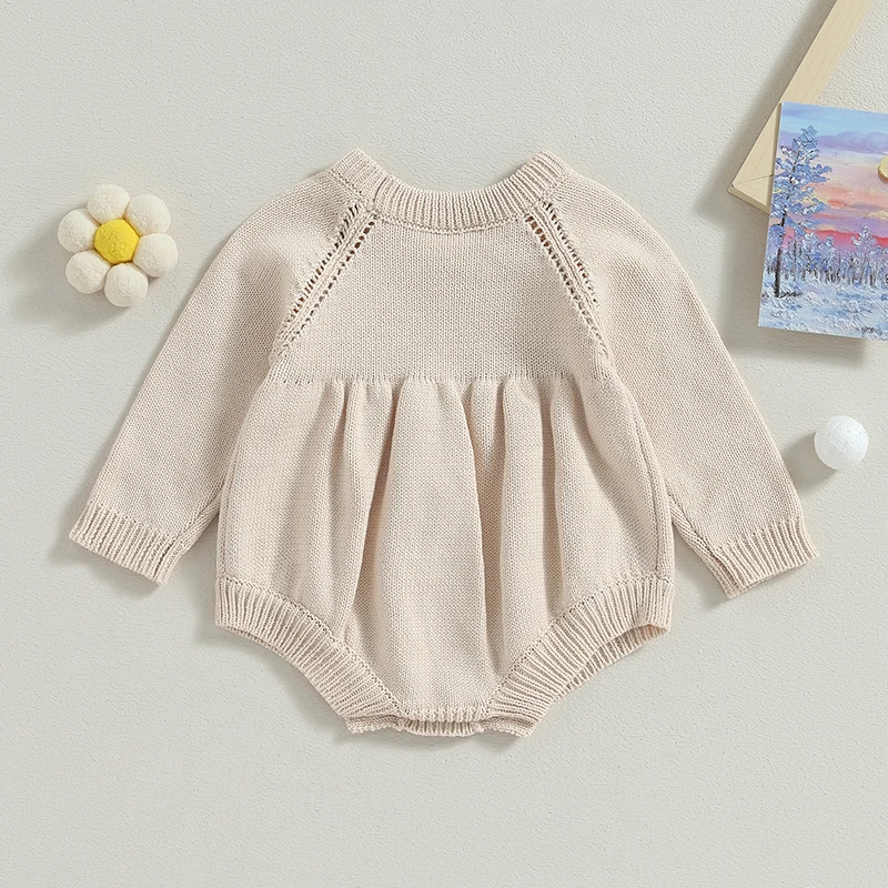 Baby Girls Knit Rompers 3D Flower Embroidery Crew Neck Long Sleeve Toddler Jumpsuits Fall Sweater Bodysuits