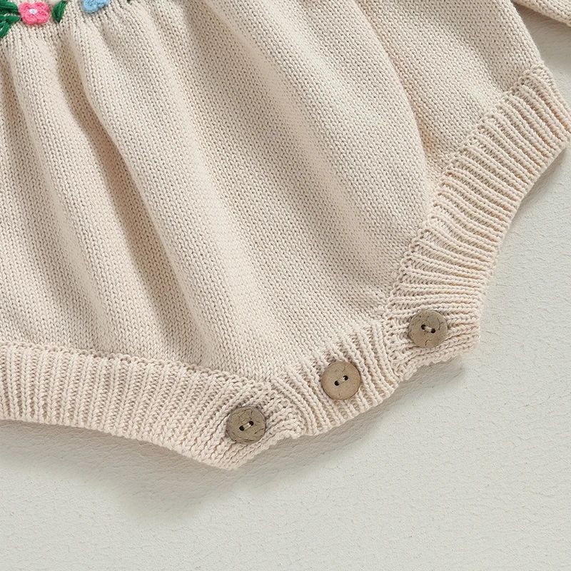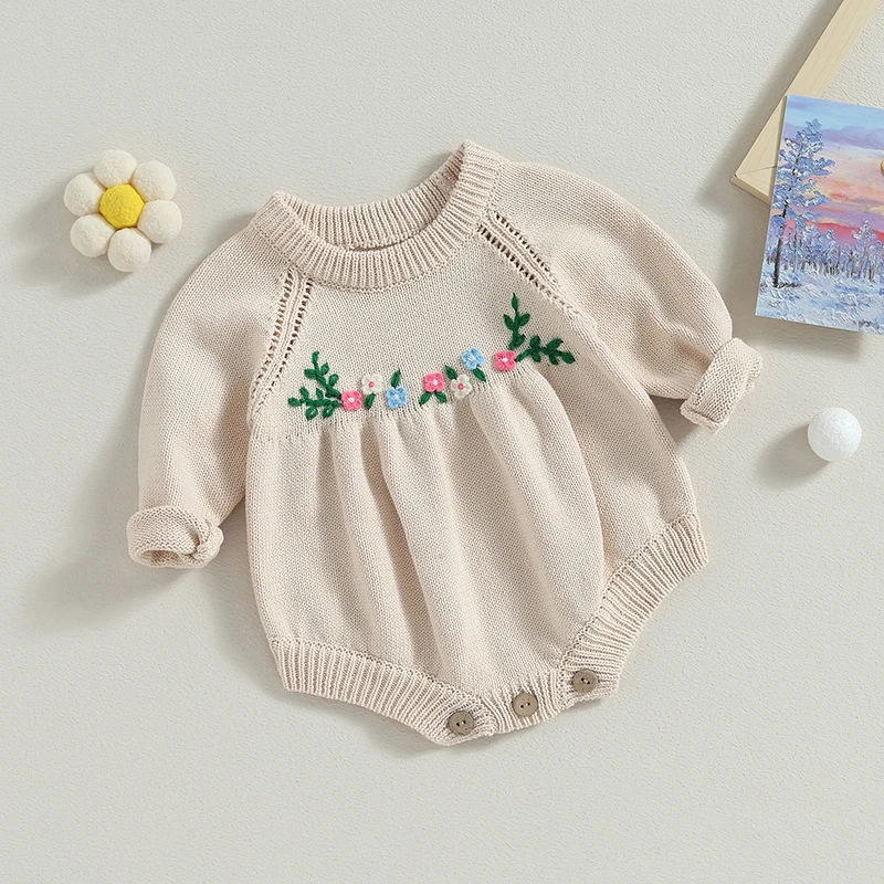 Infant Girls Floral Embroidered Knit Rompers with Long Sleeves and Crew Neckline - Cozy Toddler Jumpsuits for Autumn