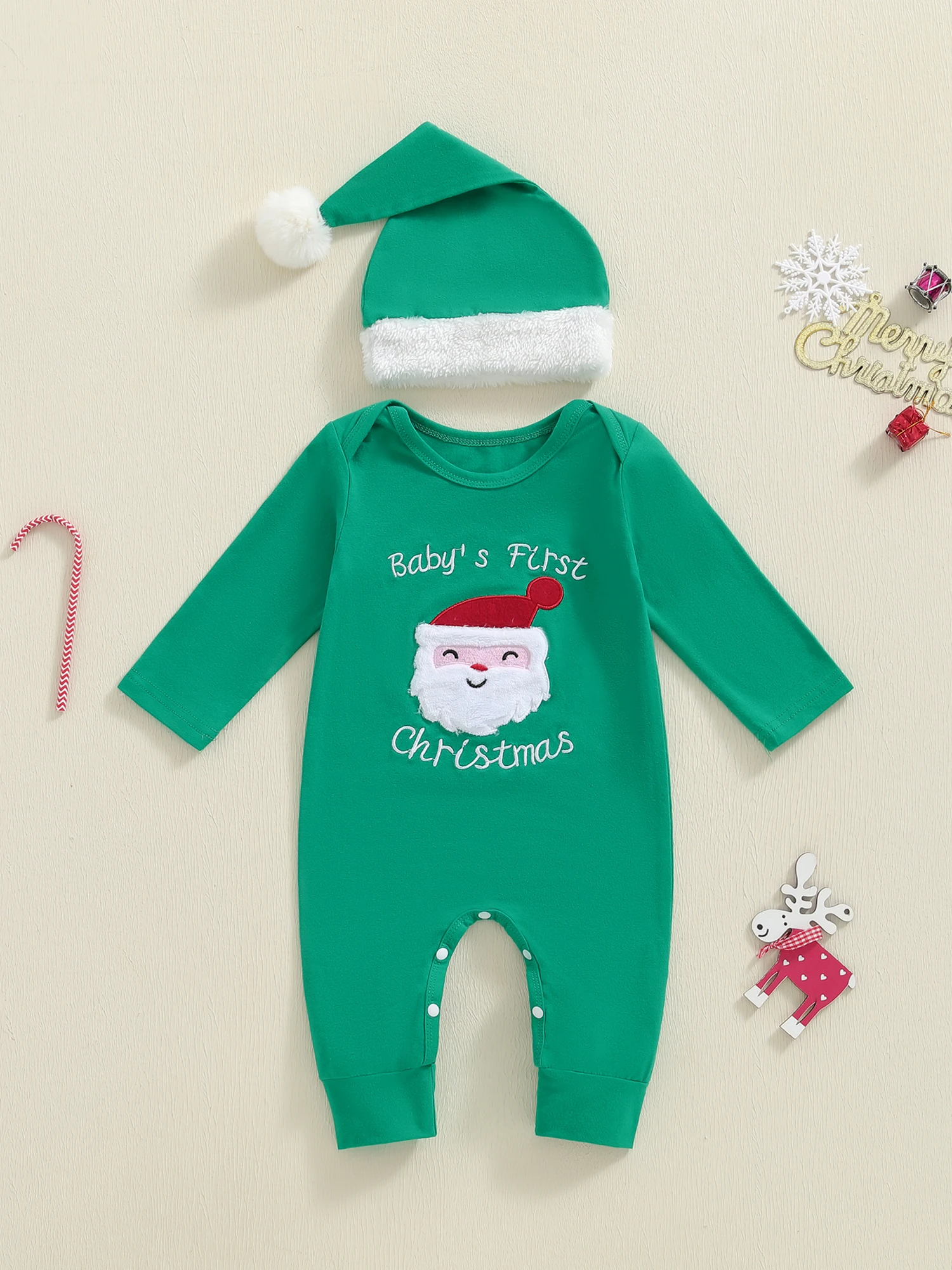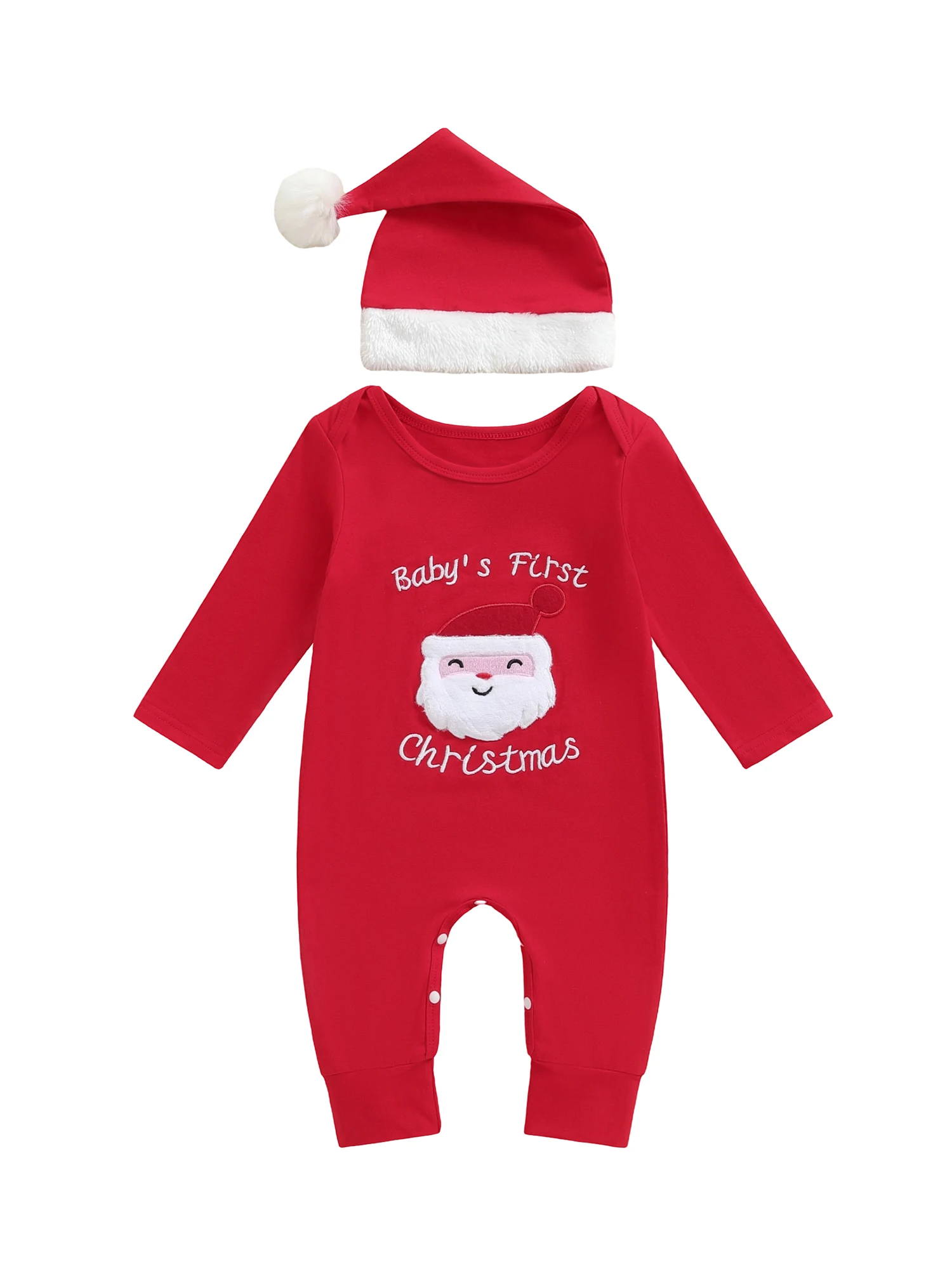 Infant Holiday Romper with Festive Santa Claus Embroidery Long Sleeves Round Neck and Matching Hat for Christmas Fun
