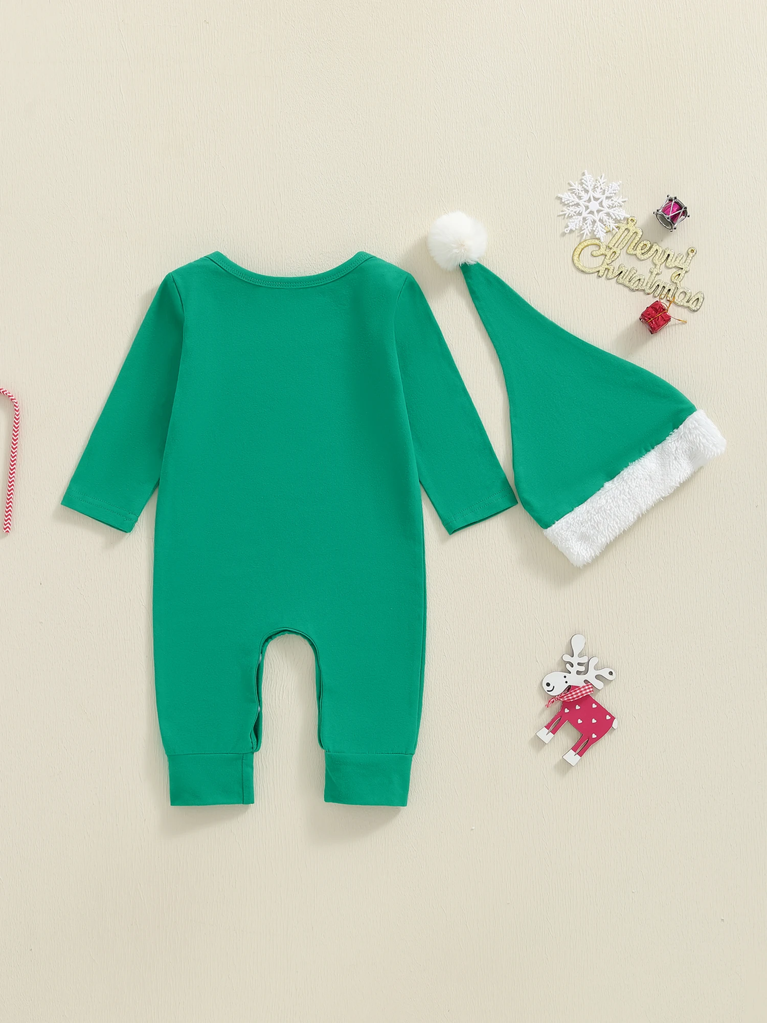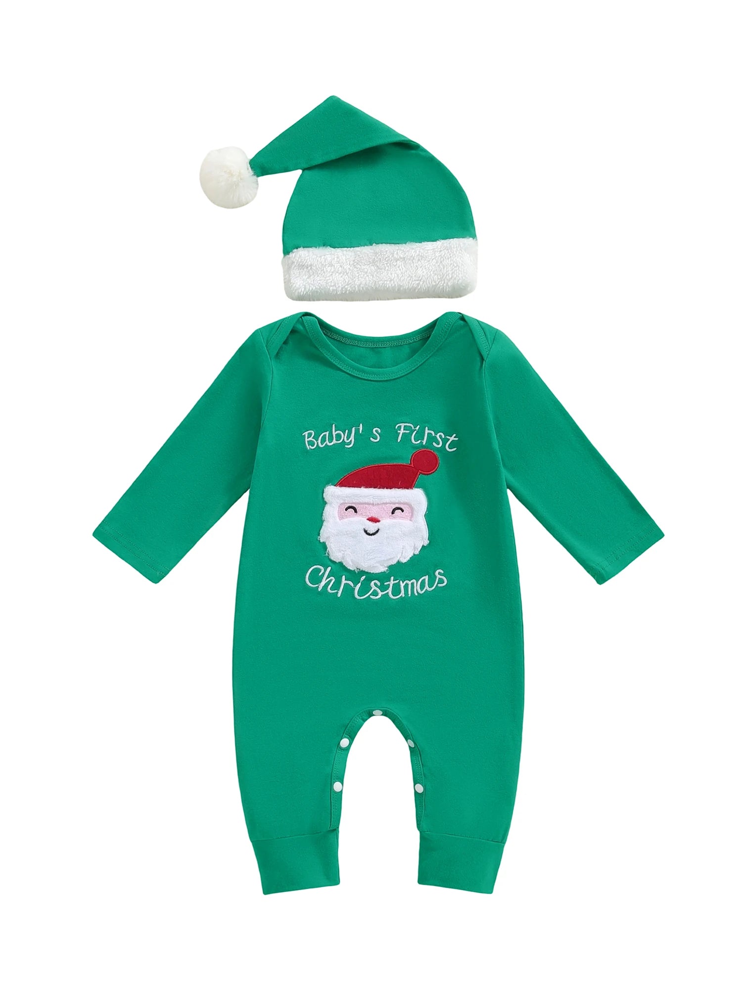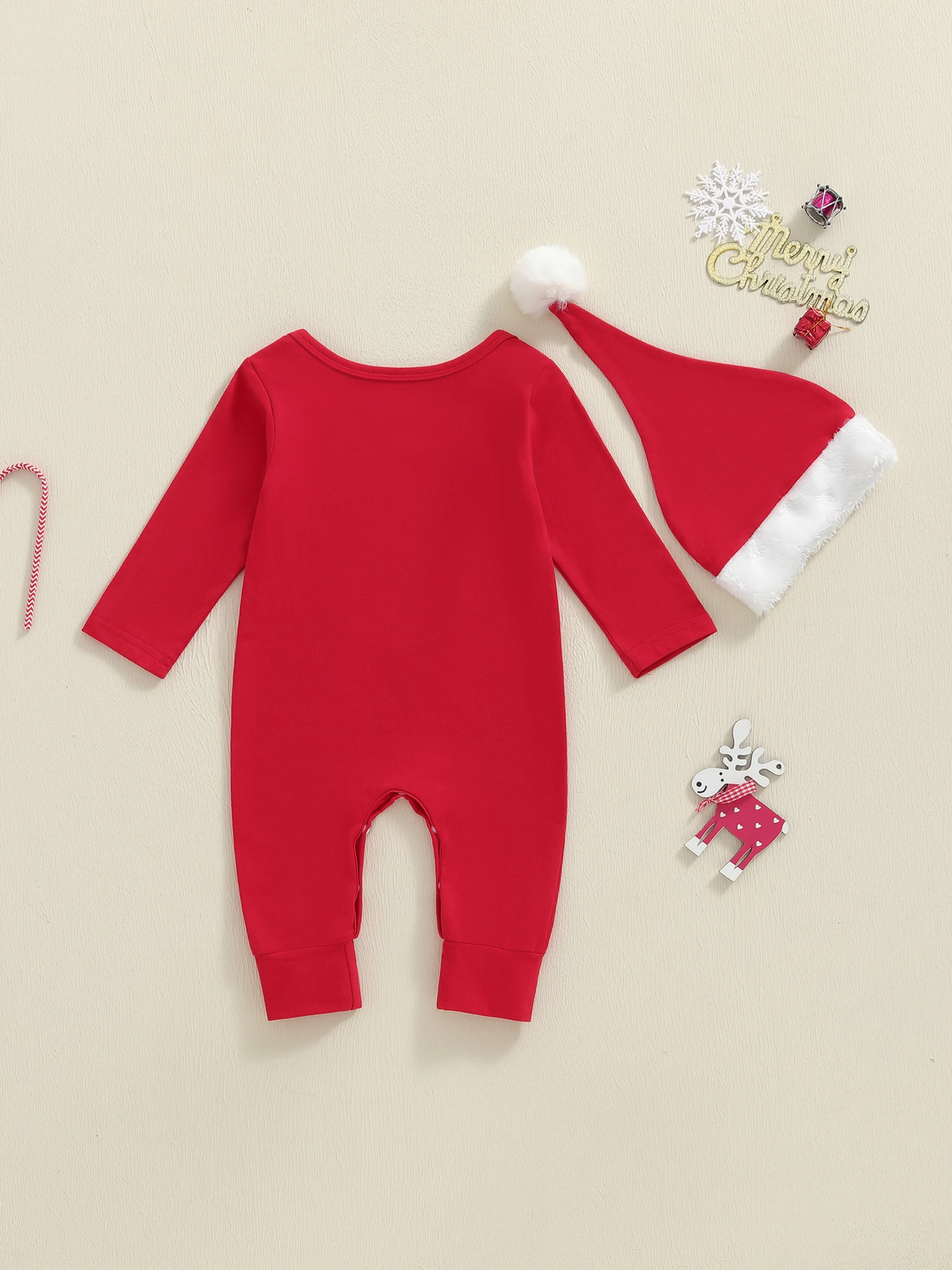 Baby Christmas Romper Santa Letter Embroidery Long Sleeve Round Neck Jumpsuit with Hat
