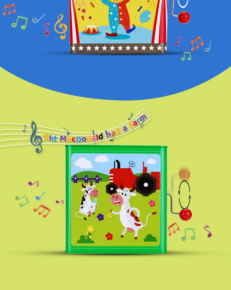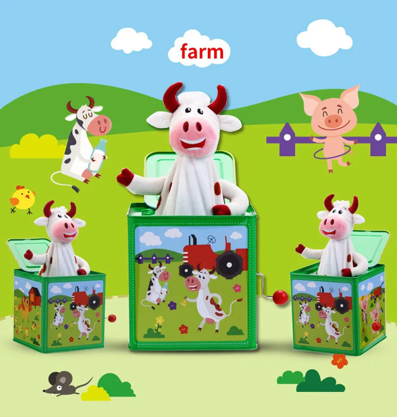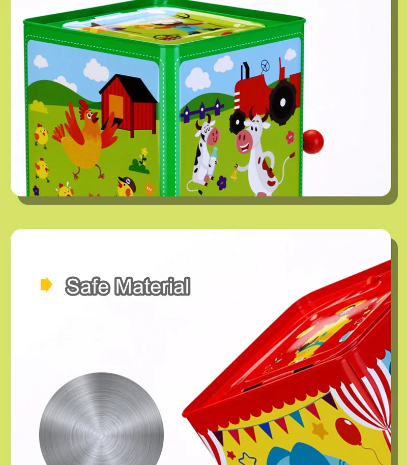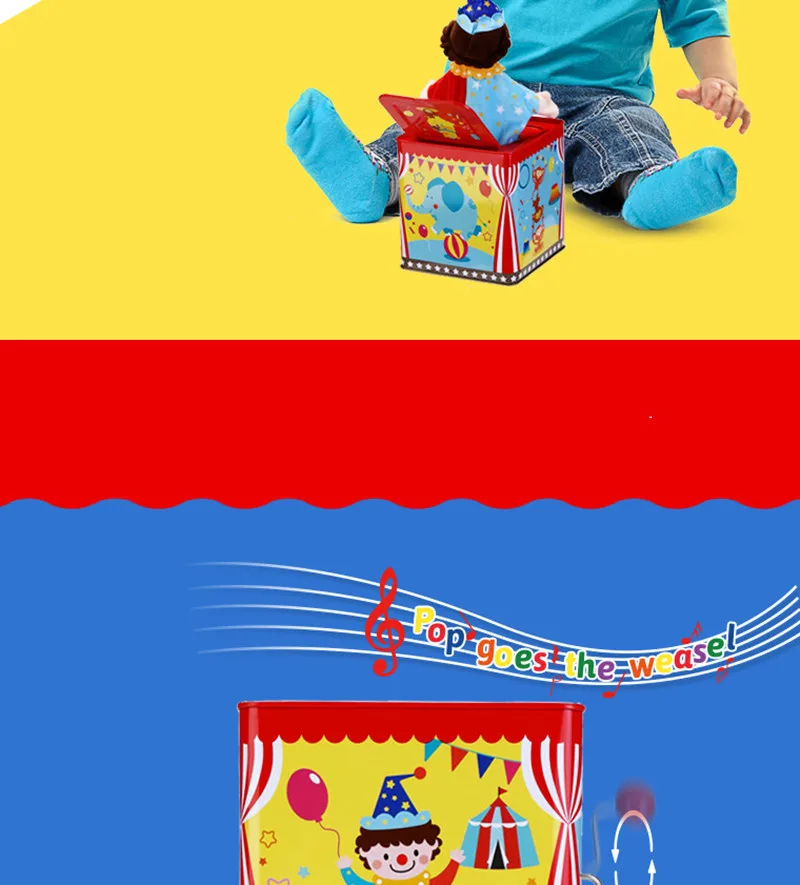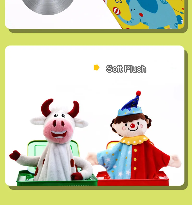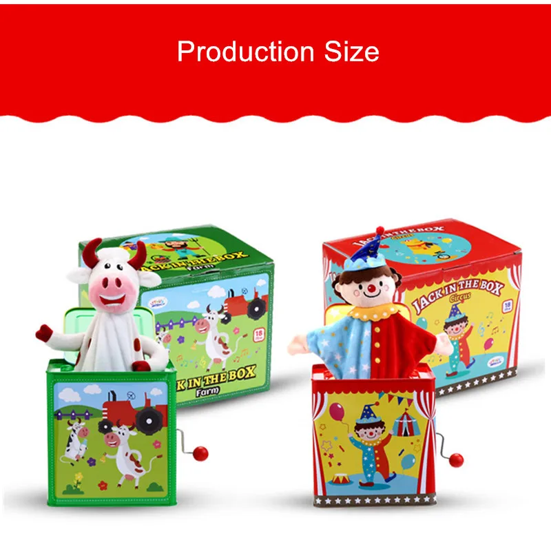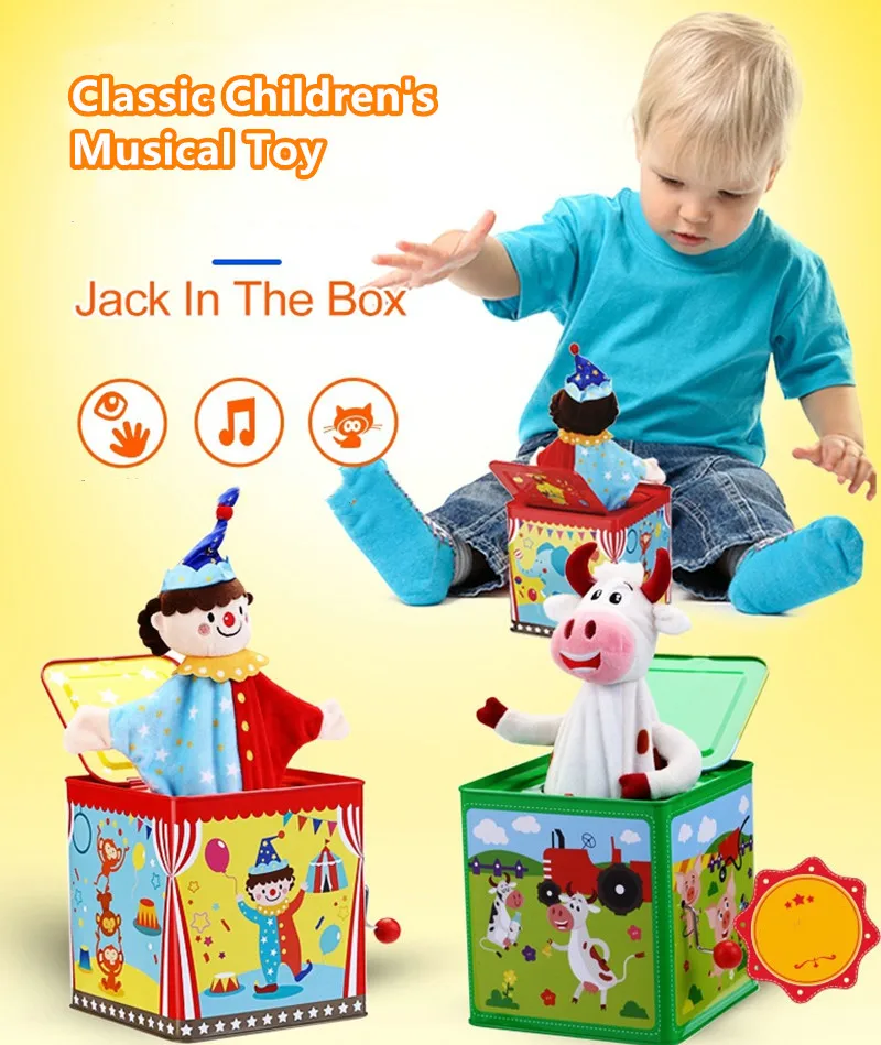 LASTING FUN: Classic jack in the box musical toy is made of durable, sturdy metal and plush puppet pop up.