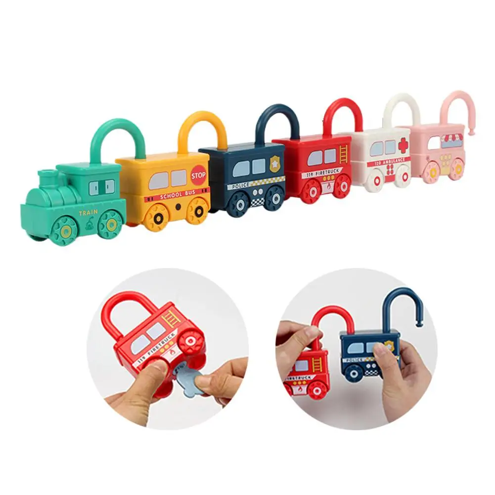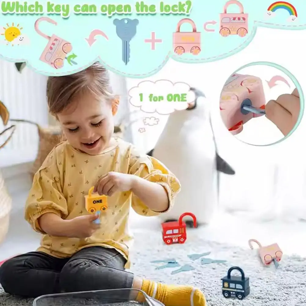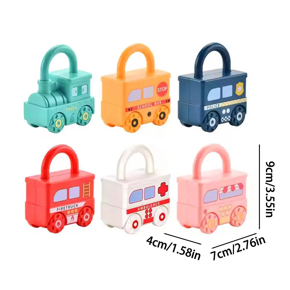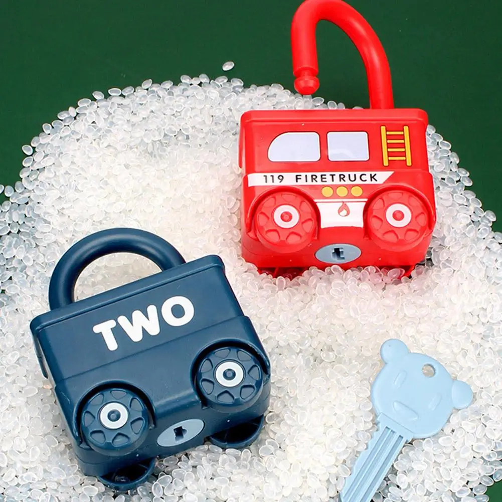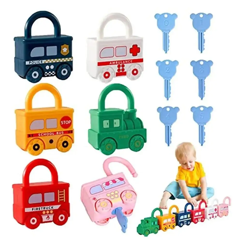 [Number Matching Toy] The learning lock set includes six car locks (police car, fire truck, ambulance, ice cream truck, school bus, and bus) and six keys. The locks are printed with different English numbers and countable dots, so you must select the right key to open them, which helps your child develop hands-on skills and recognition skills.