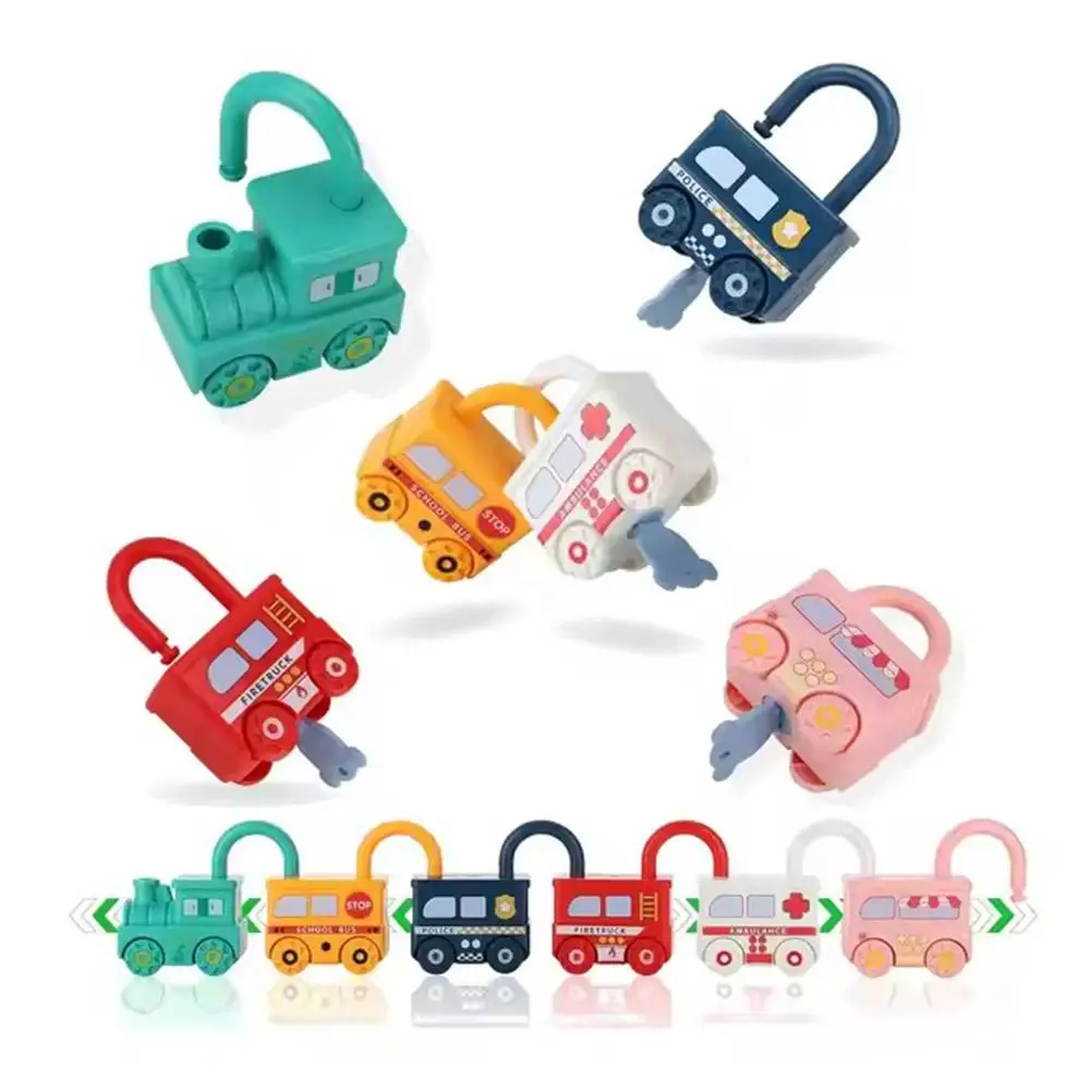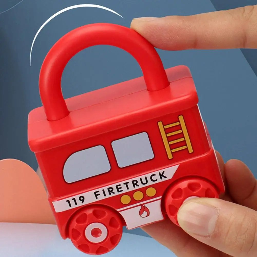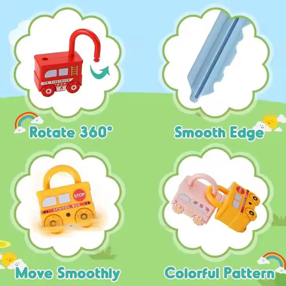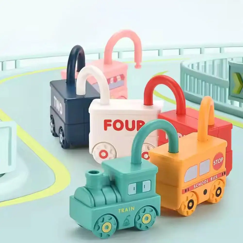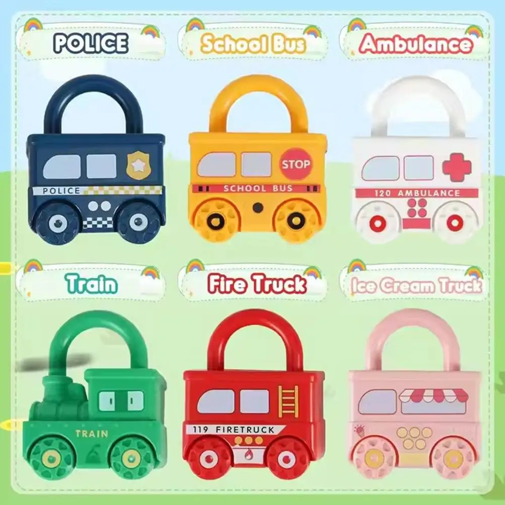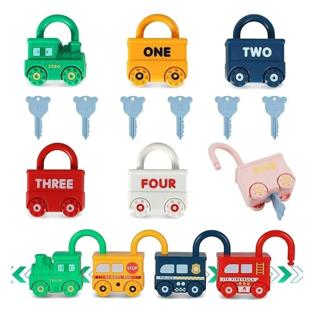 [Number Matching Toy] The learning lock set includes six car locks (police car, fire truck, ambulance, ice cream truck, school bus, and bus) and six keys. The locks are printed with different English numbers and countable dots, so you must select the right key to open them, which helps your child develop hands-on skills and recognition skills.