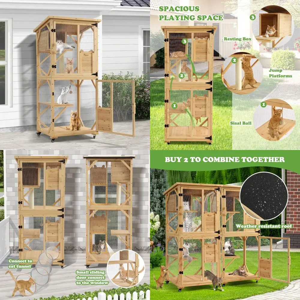 This product is a four-tier wooden cat enclosure designed to provide ample space and comfort for your cats. It features three jumping platforms, a sisal post, a sisal ball, a resting box, a removable floor, two lockable doors, and two small doors, allowing your pets to enjoy jumping and playing. The cat house can be connected to an interior window or cat fence via the small sliding door, enabling your pet to move freely between indoors and outdoors. Made from high-quality wood and waterproof asphalt roofing, this outdoor cat house is sturdy, durable, and can protect your pet from sun, rain, and natural predators. The cat cages come equipped with four durable metal wheels, two of which are braked casters, for easy movement both indoors and outdoors, and to secure the cage in place after moving. The catio includes a removable wooden floor panel, which can be taken out to create more space for multiple cats, with the capacity to accommodate up to six cats playing together.