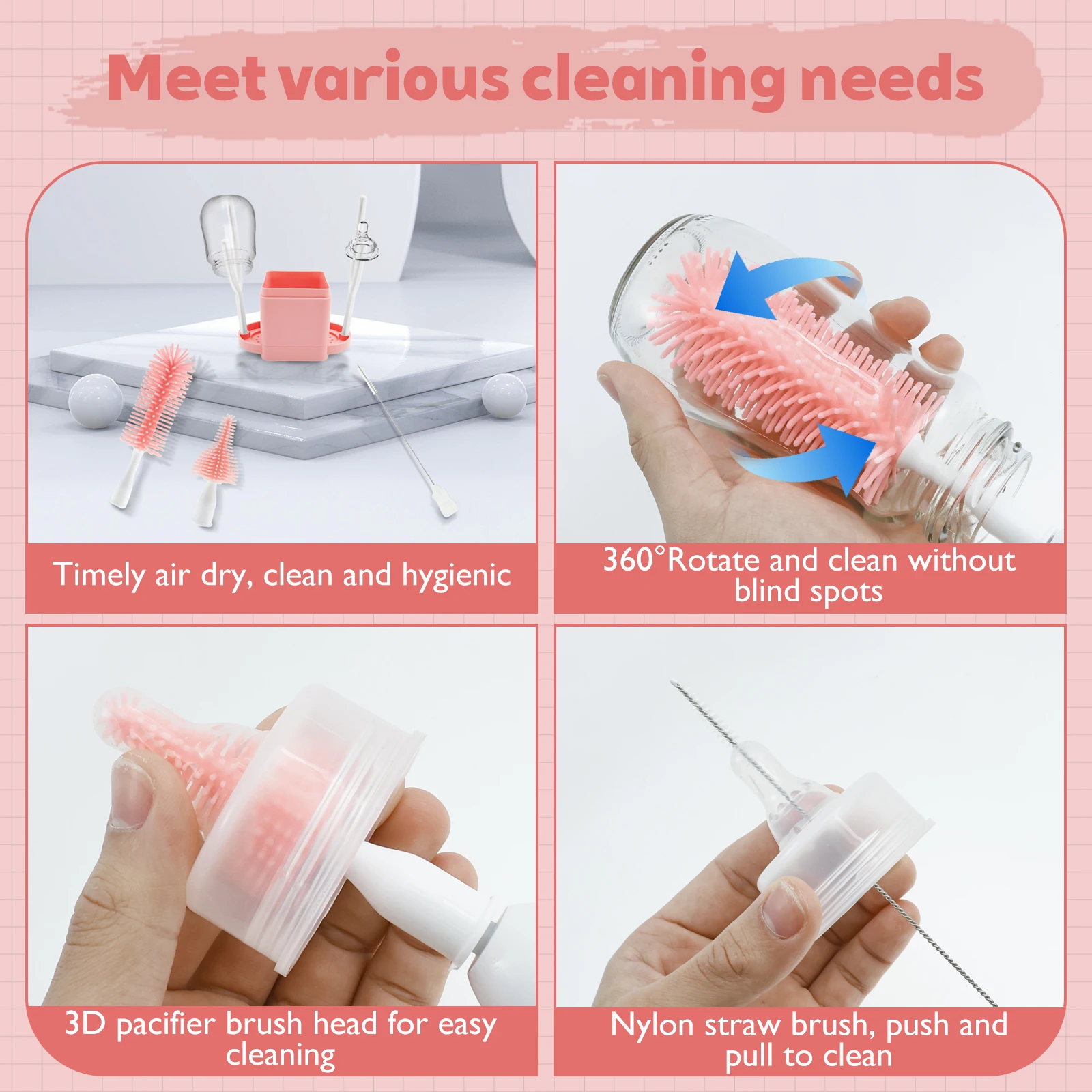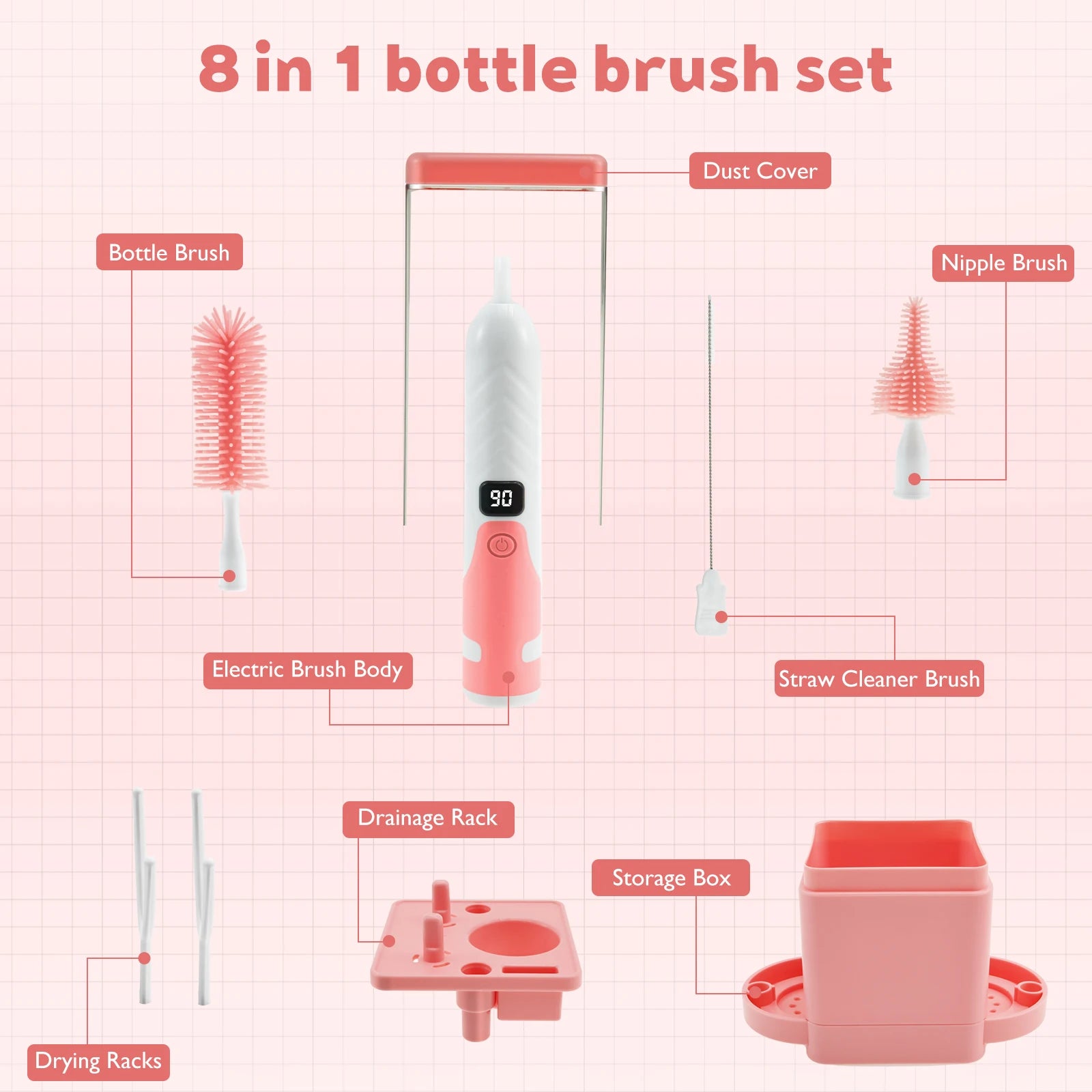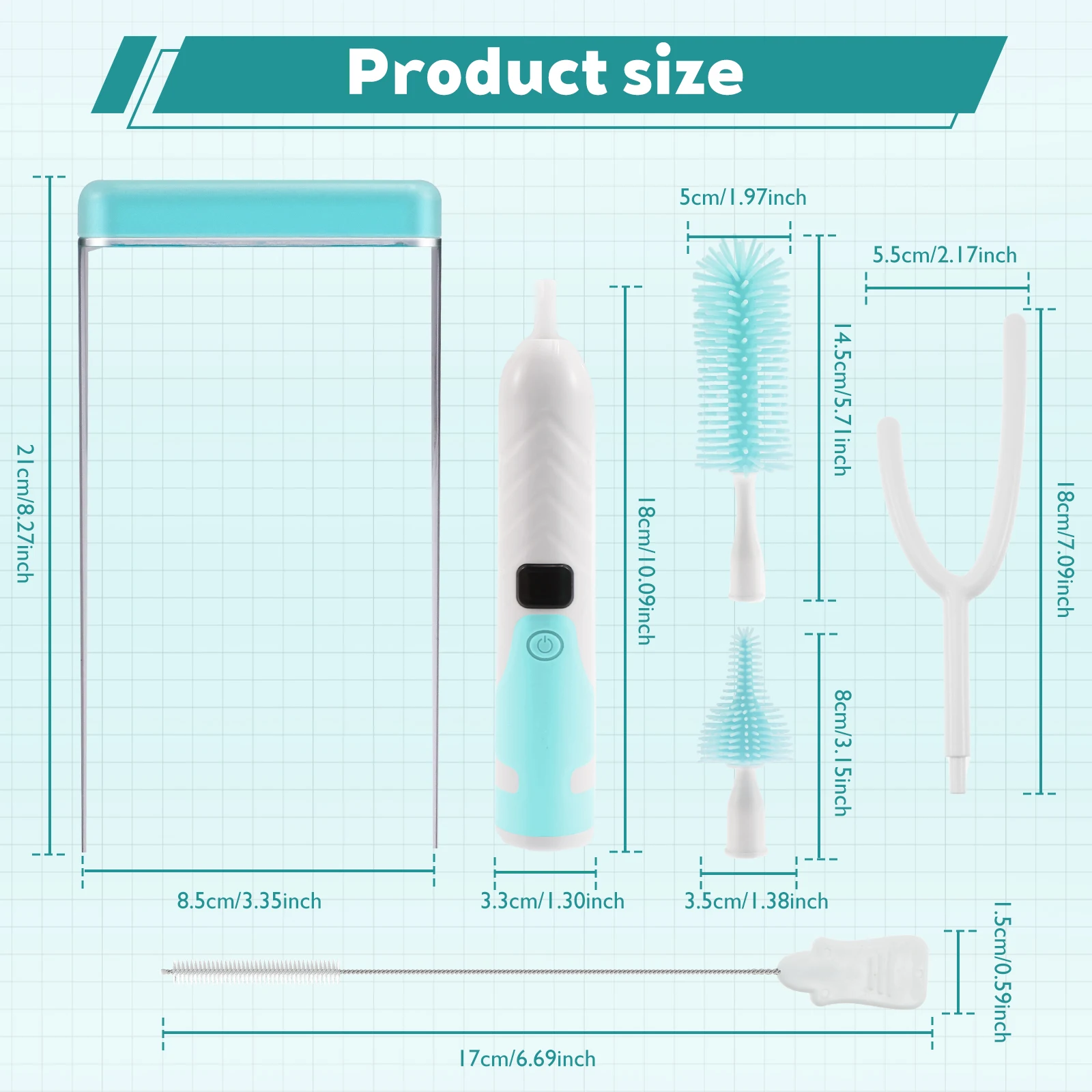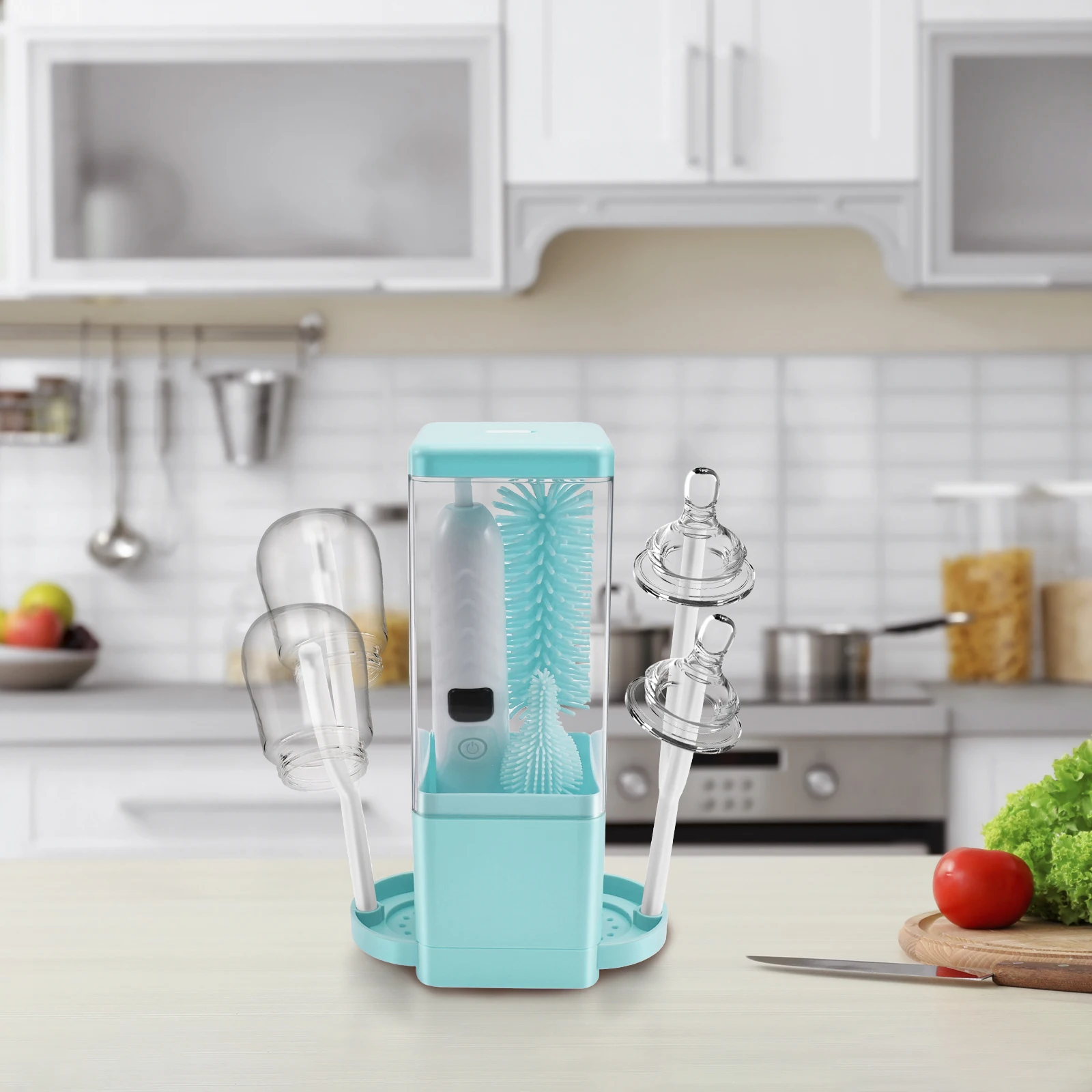 Complete Cleaning Kit: This set includes a bottle brush, nipple brush, straw brush, dustproof storage box, USB charging cable, electric brush body, drainage rack, and two bottle drying racks, providing a comprehensive cleaning solution for parents