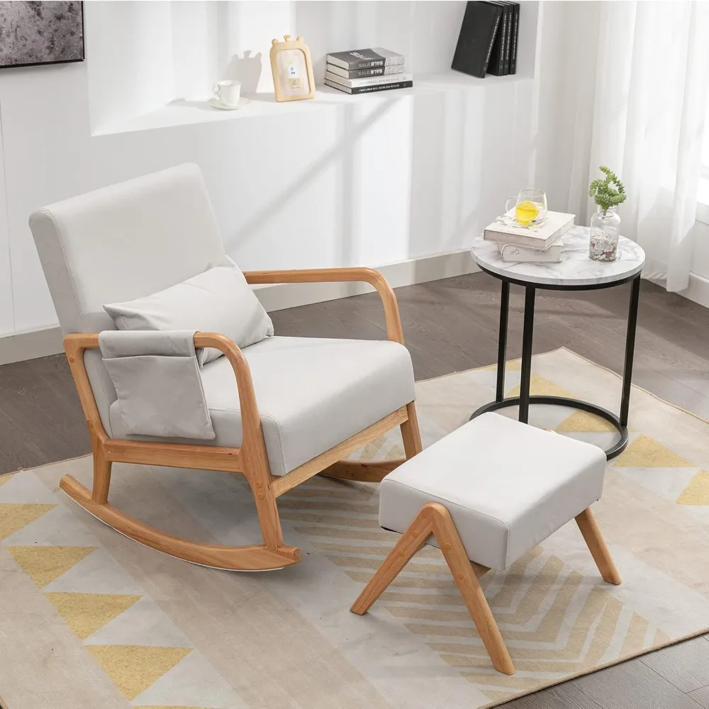 - [ OCCASIONS ]: This mid century rocking chair with ottoman gives you everything you want while taking up much less space. It's not only great for seniors to sit in the chair and read the newspaper or watch TV, but also for mothers to sit in the chair and put their babies to sleep. You can place the nursery rocking chair in your living room, bedroom or den and enjoy the comfort and fun of a glider chair anytime you want.