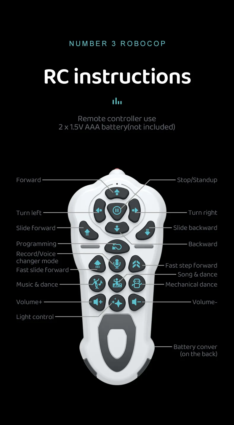 7. Remote control forward, backward, left turn, right turn, fast forward mode, music and dance mode, lighting remote control mode, volume debugging mode, programming mode