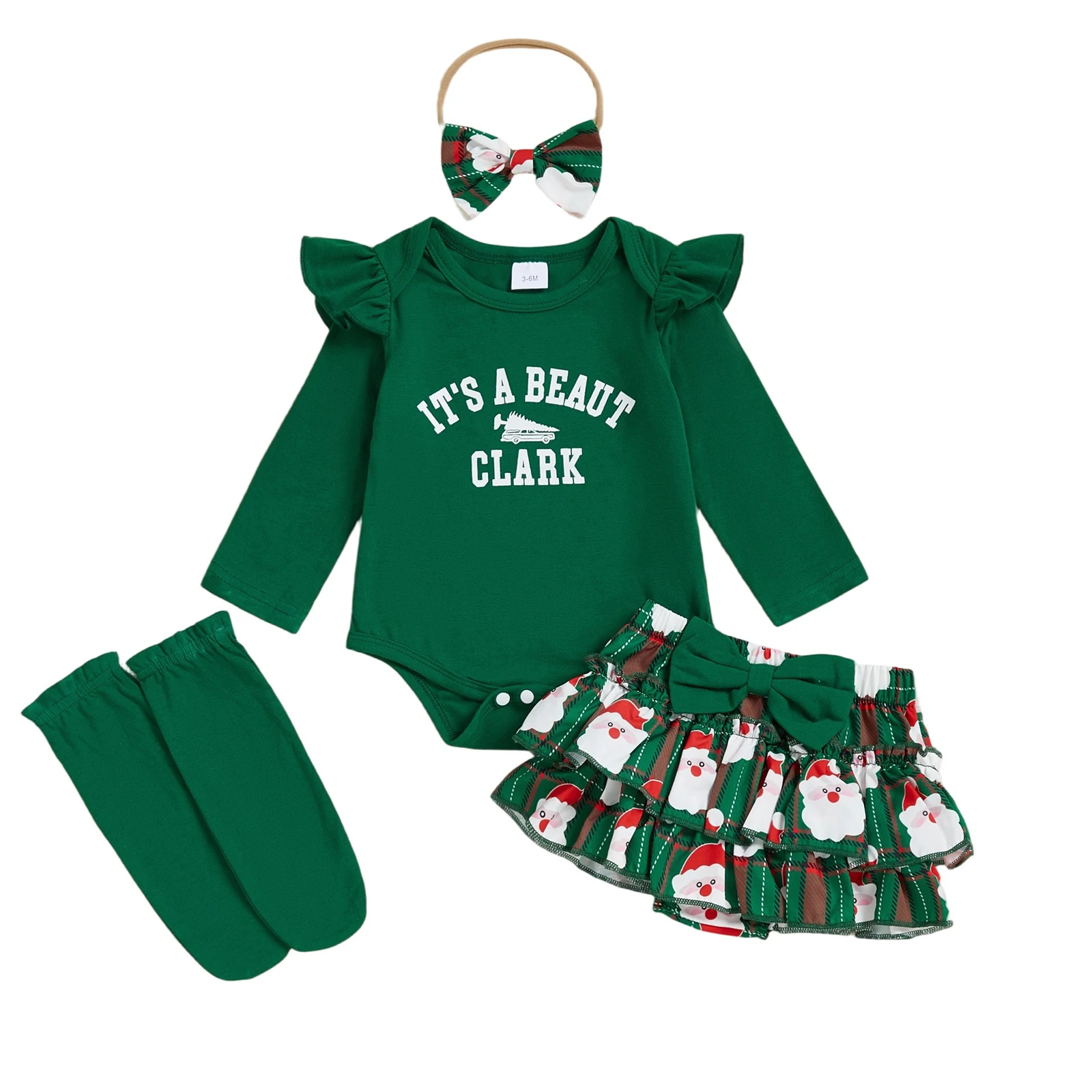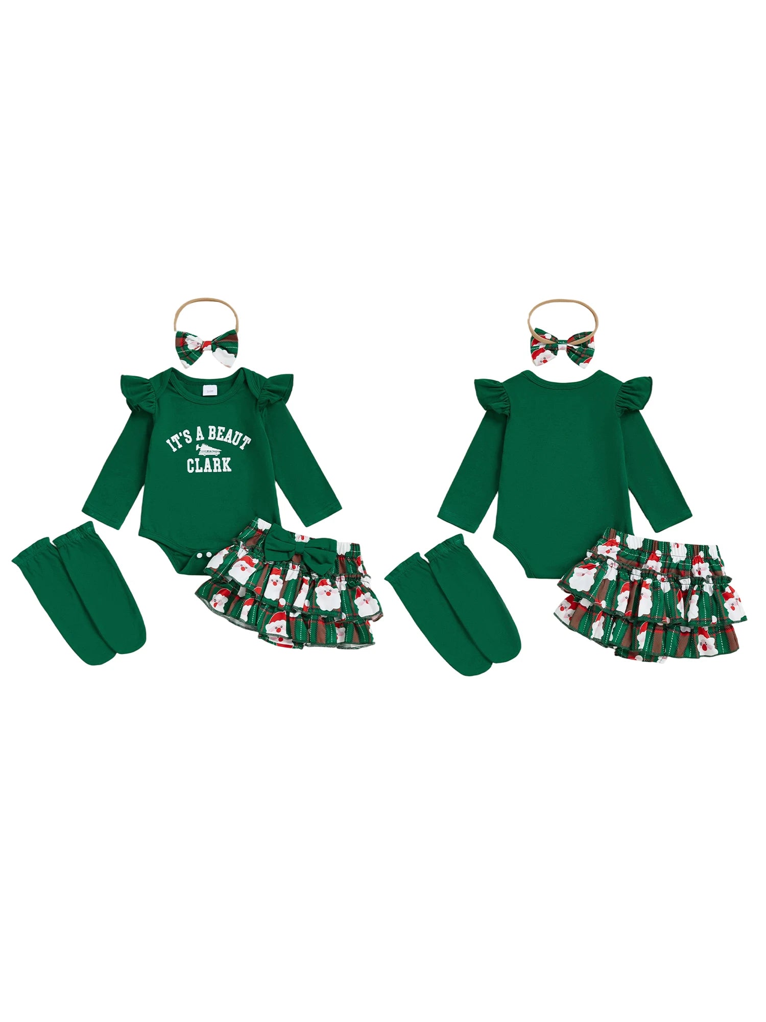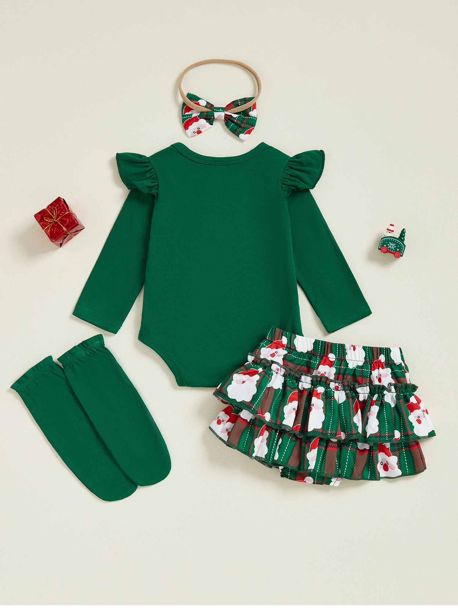Baby Girl Christmas Outfit Letter Print Long Sleeve Romper Santa Skirt Bow Headband Long Socks Set