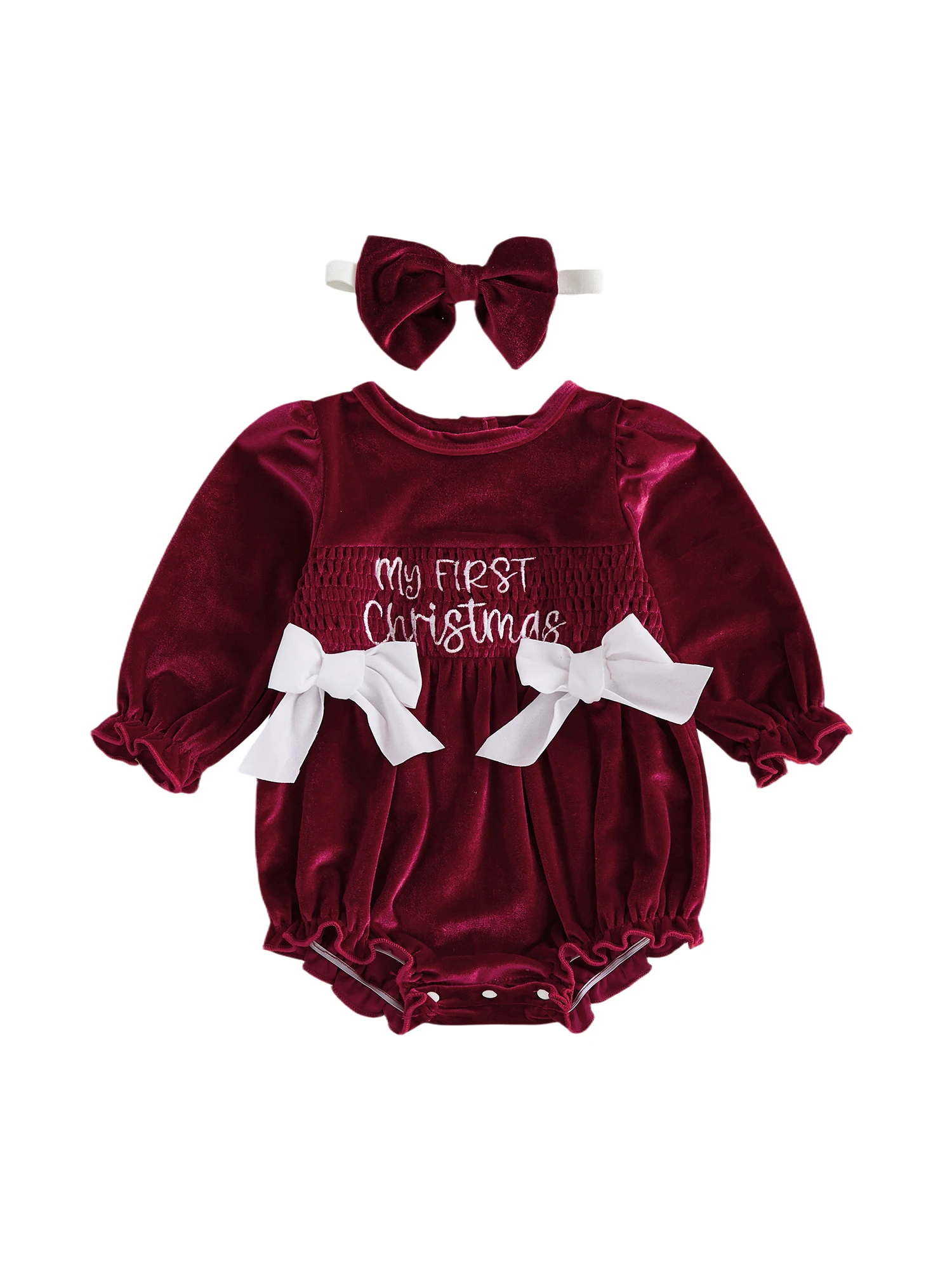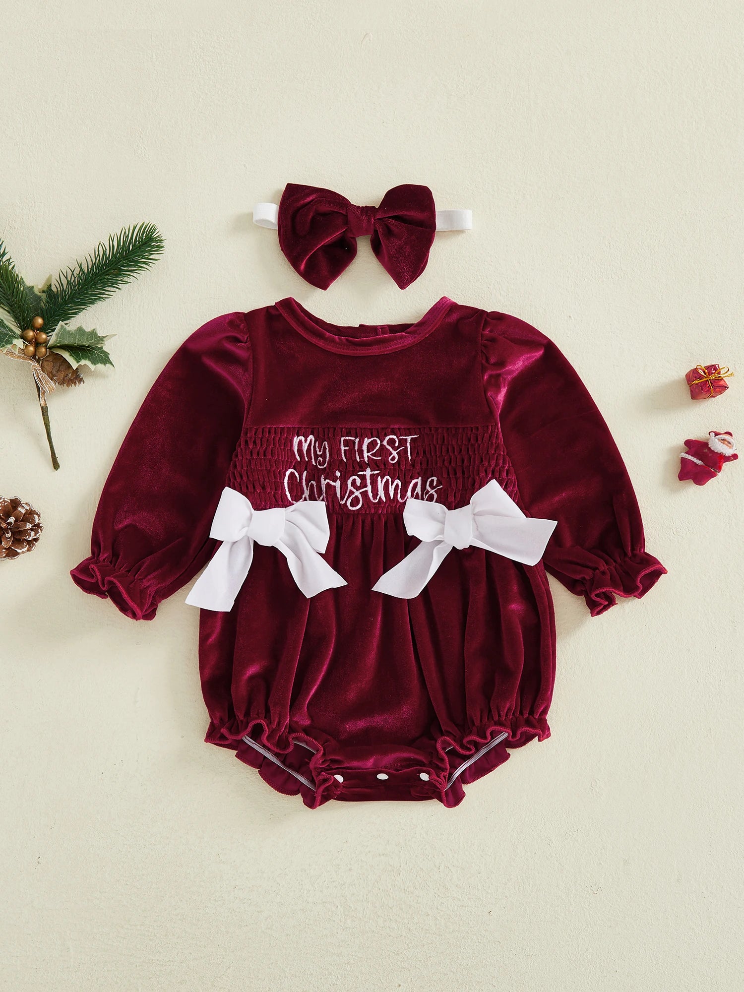 Baby Girl Christmas Outfit Letter Embroidery Long Sleeve Velvet Romper Bow Headband 2 Piece Set