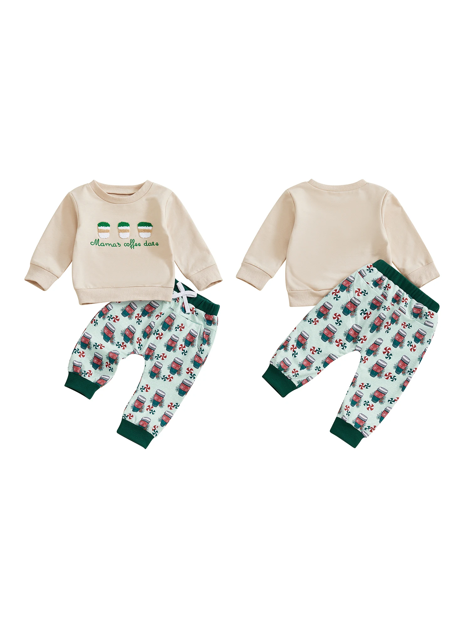 Christmas baby clothes with coffee print embroidery, warm and cozy; Boys sweatshirt with round neck and long sleeve design; Baby boy pants with elastic waist design to ensure a comfortable fit, perfect for daily wear