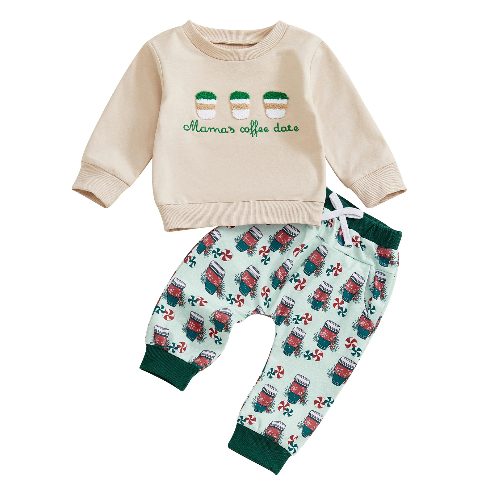 Baby Boy Christmas Outfit Coffee Print Embroidery Long Sleeve Sweatshirt and Elastic Pants 2 Piece Clothes for Toddler