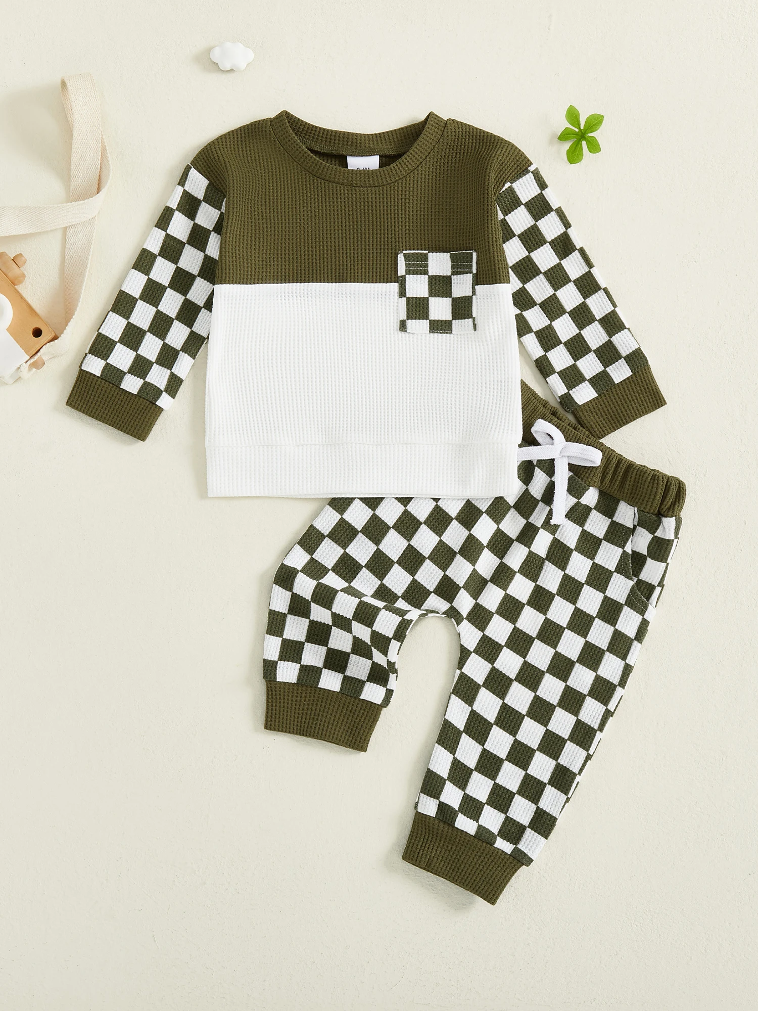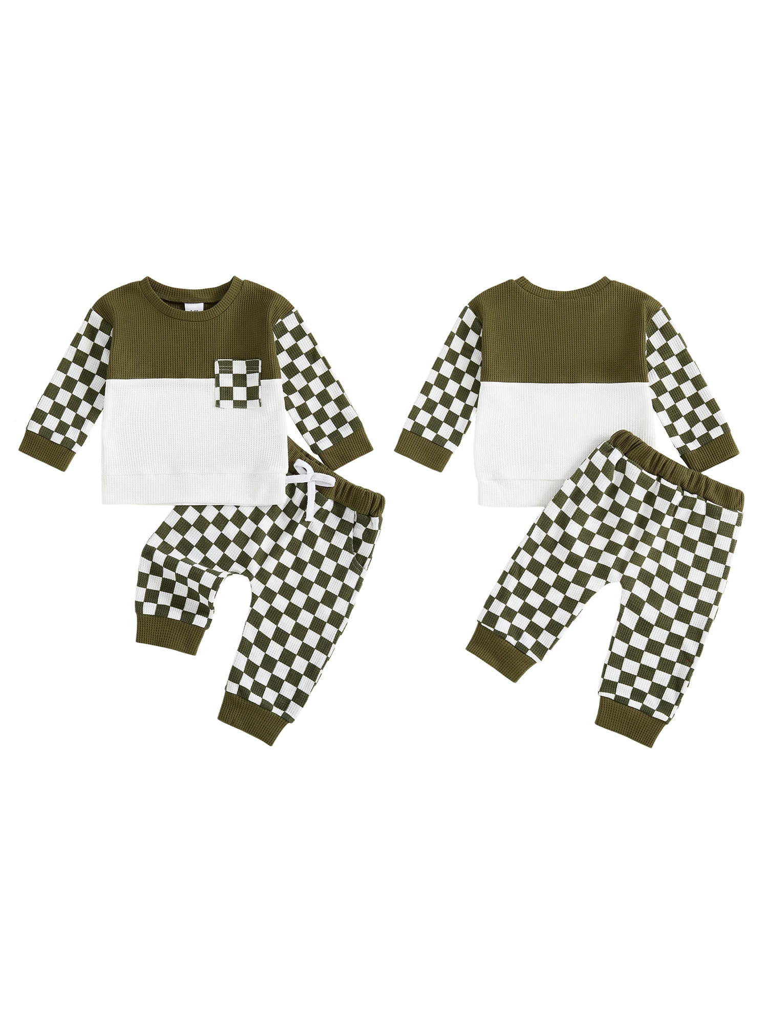 Toddler Boy Fall Waffled Outfits Checkerboard Long Sleeve Pocket Pullover + Elastic Waist Long Pants 2 Pcs Set