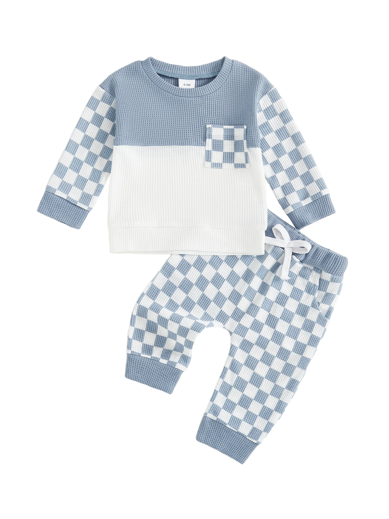 Toddler Boy Fall Waffled Outfits Checkerboard Long Sleeve Pocket Pullover Elastic Waist Long Pants 2 Pcs Set