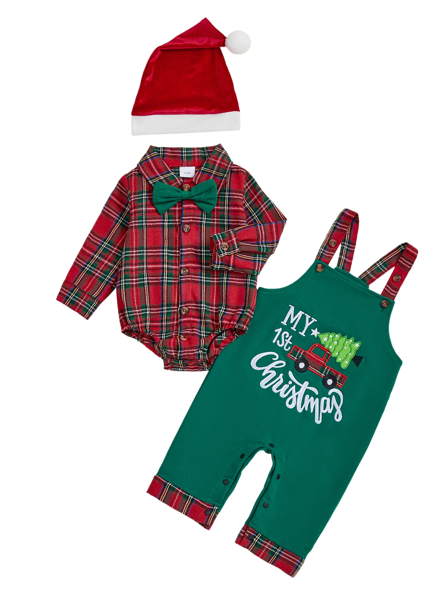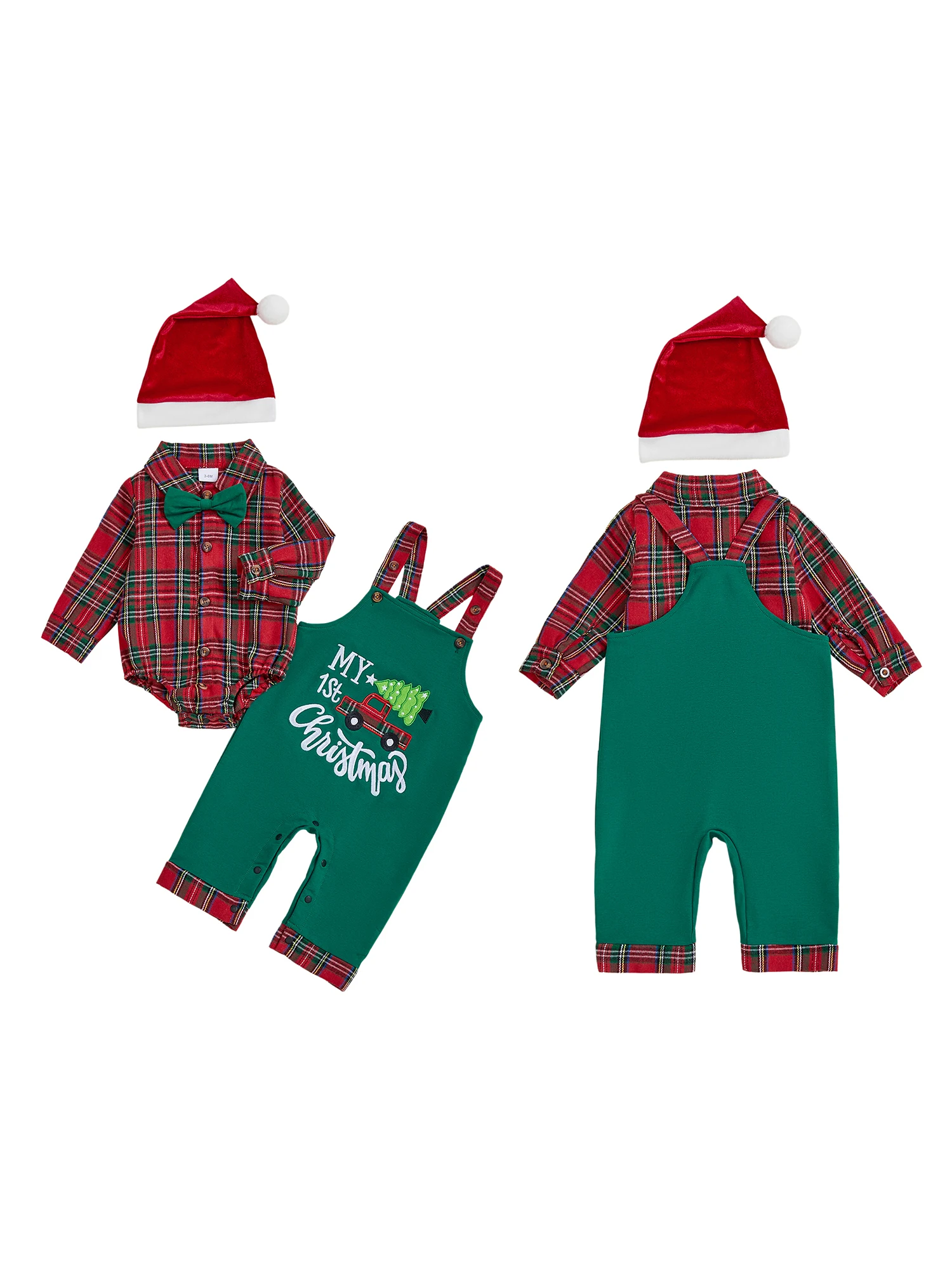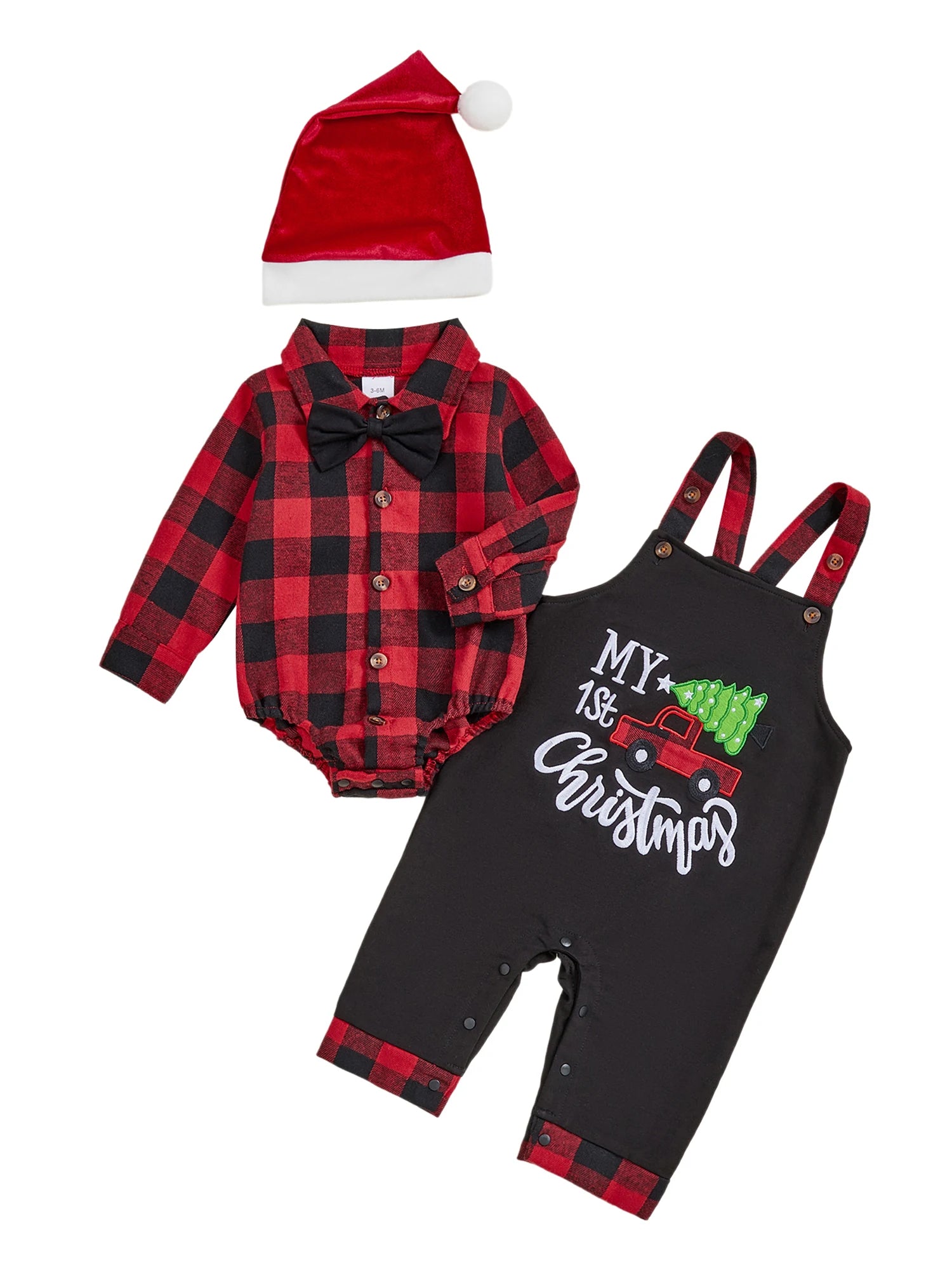 Baby Boy Christmas Clothes Plaid Long Sleeve Lapel Romper Letter Embroidery Overalls Pants and Hat 3Pcs Fall Outfit