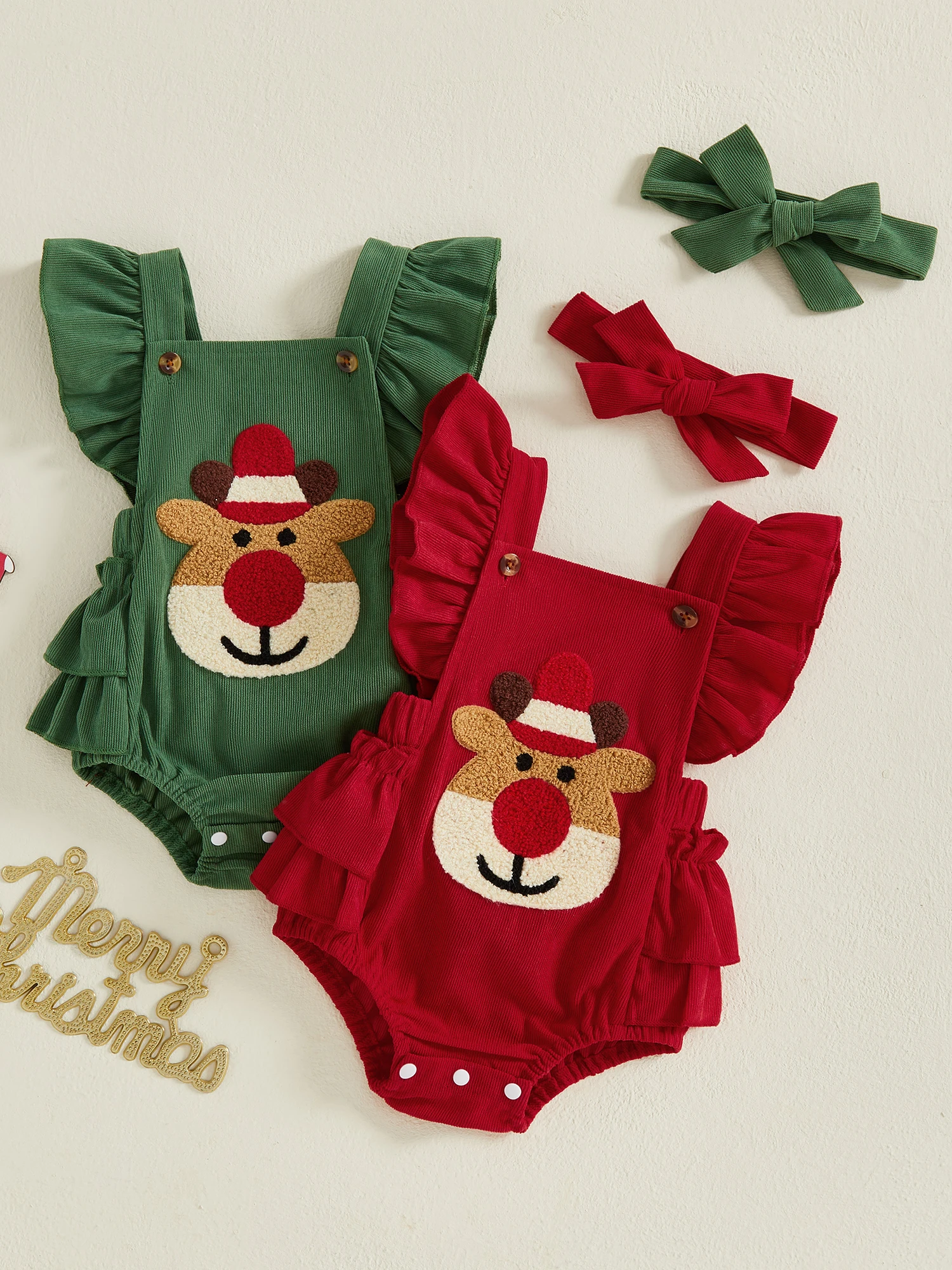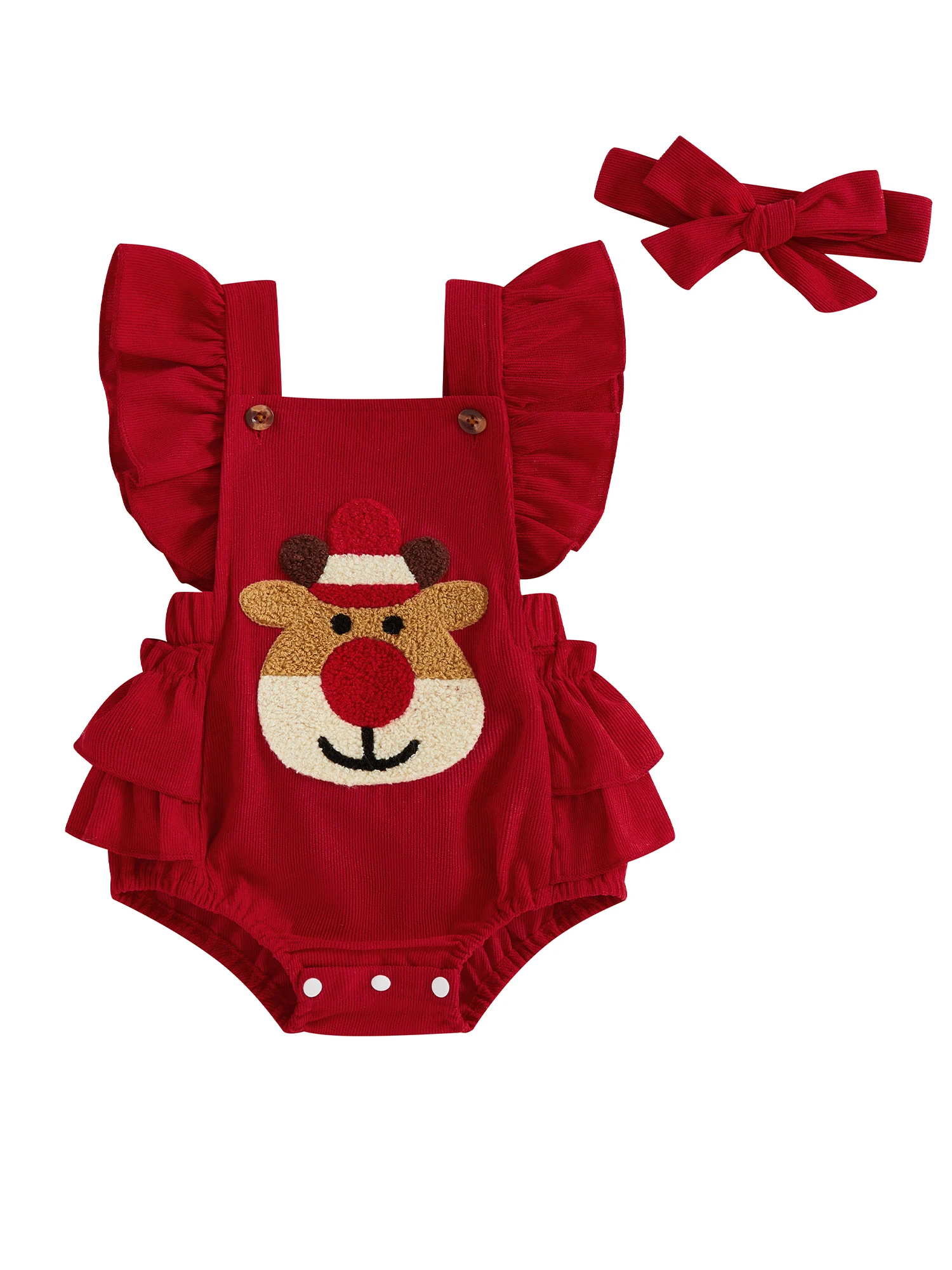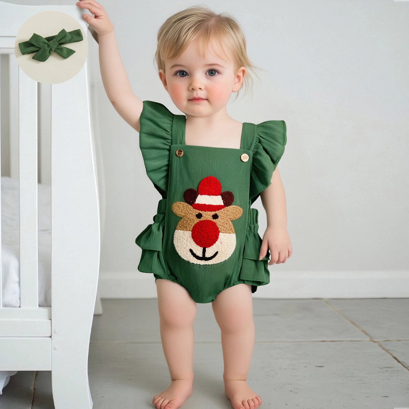 Baby Girl Christmas Outfit, Fly Sleeve Embroidery Elk Romper Overalls with Hairband for Casual Daily