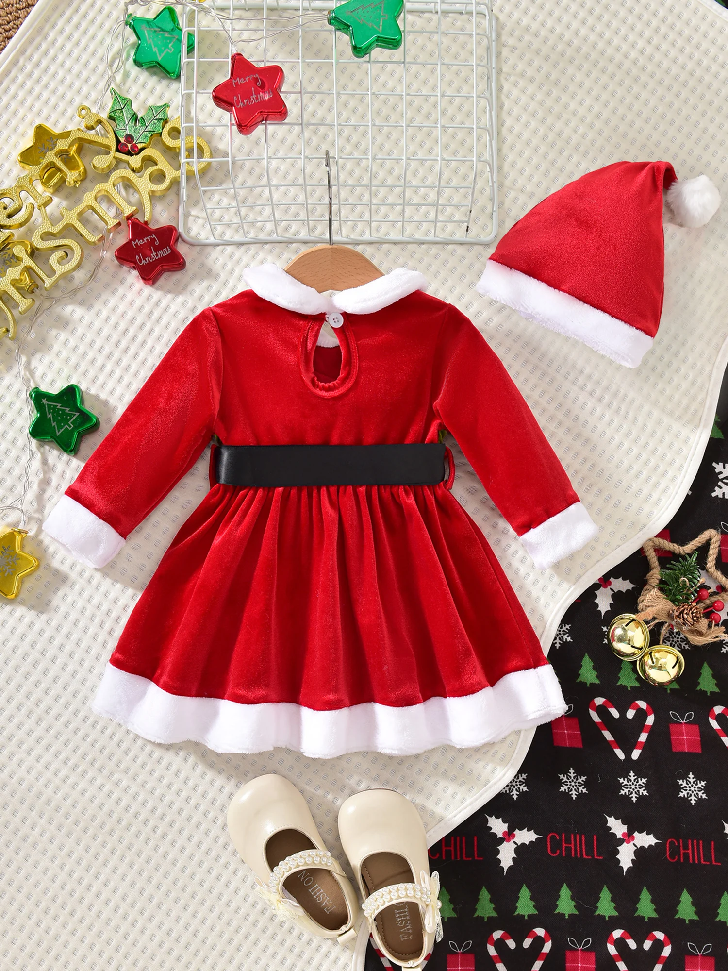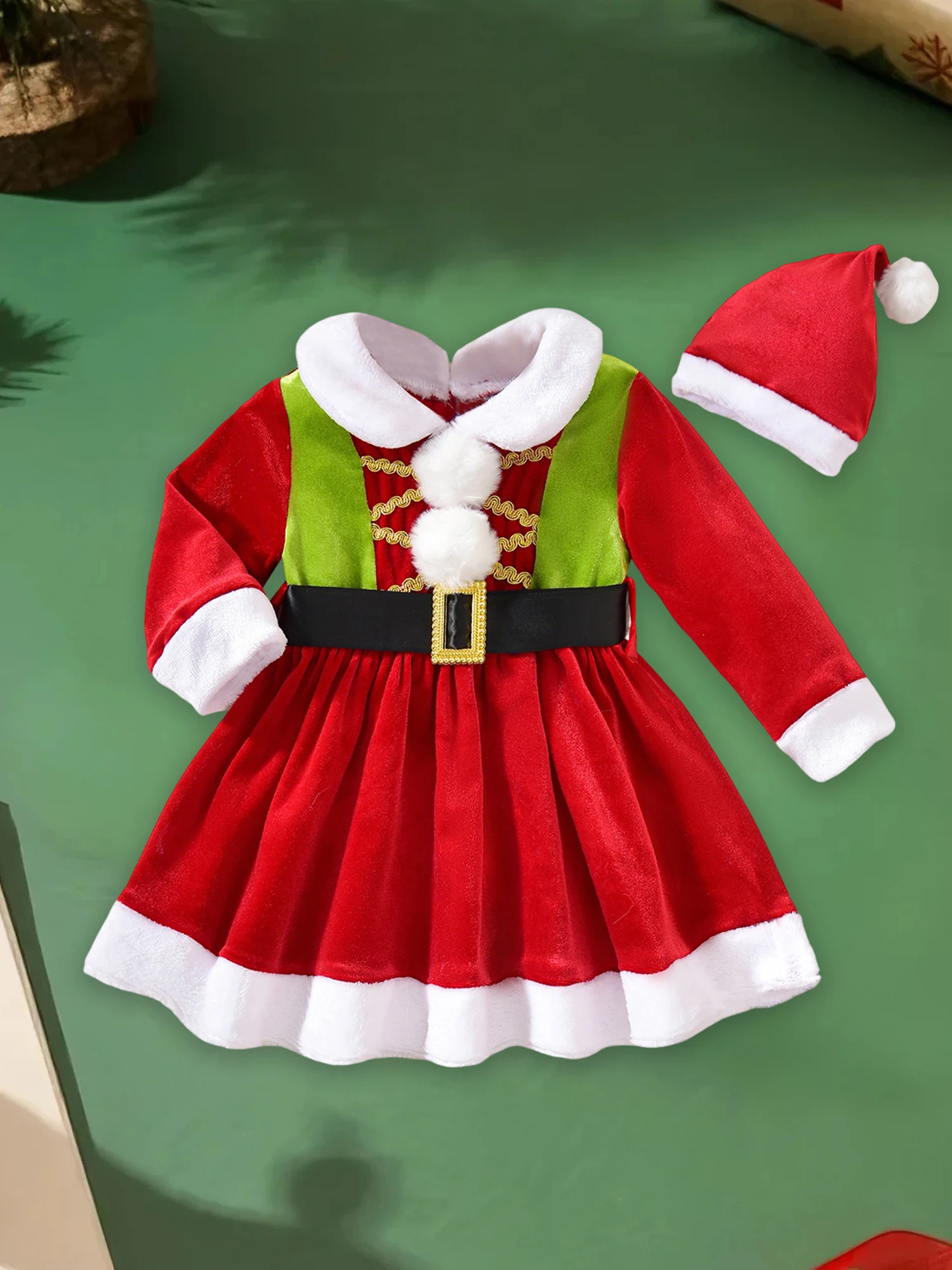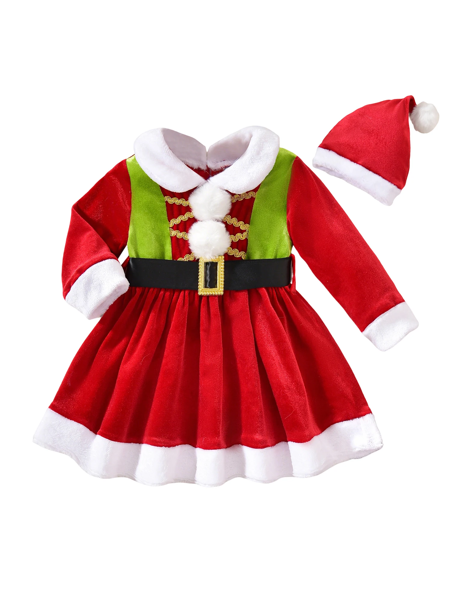 Baby Girl Christmas Outfit Fuzzy Trim Velvet Long Sleeve Romper Dress and Santa Hat 2 Piece Set