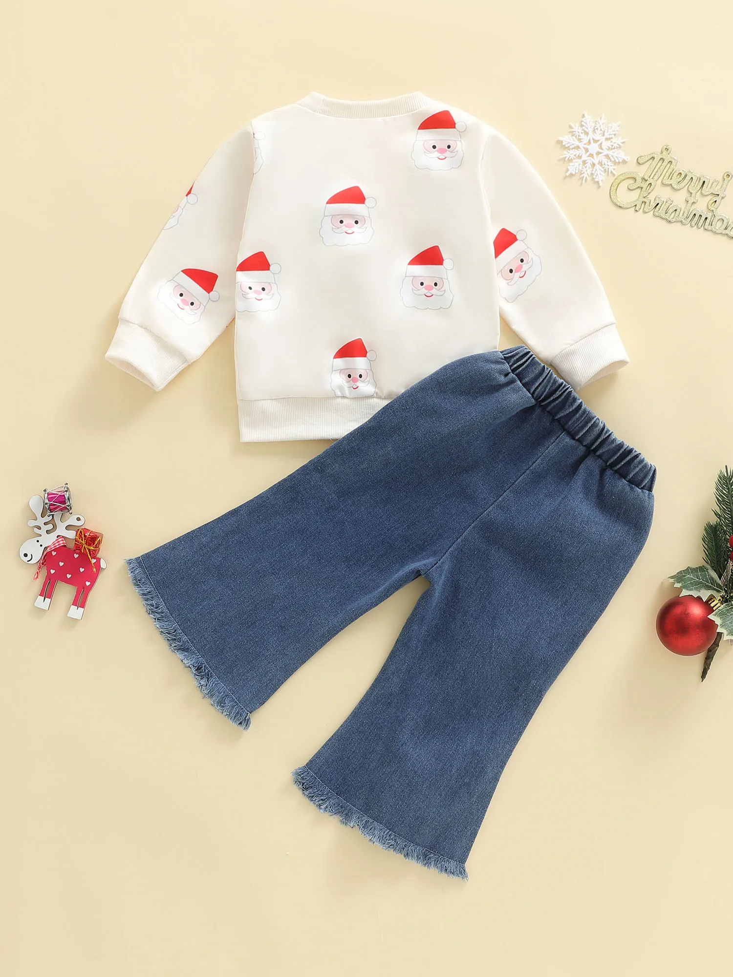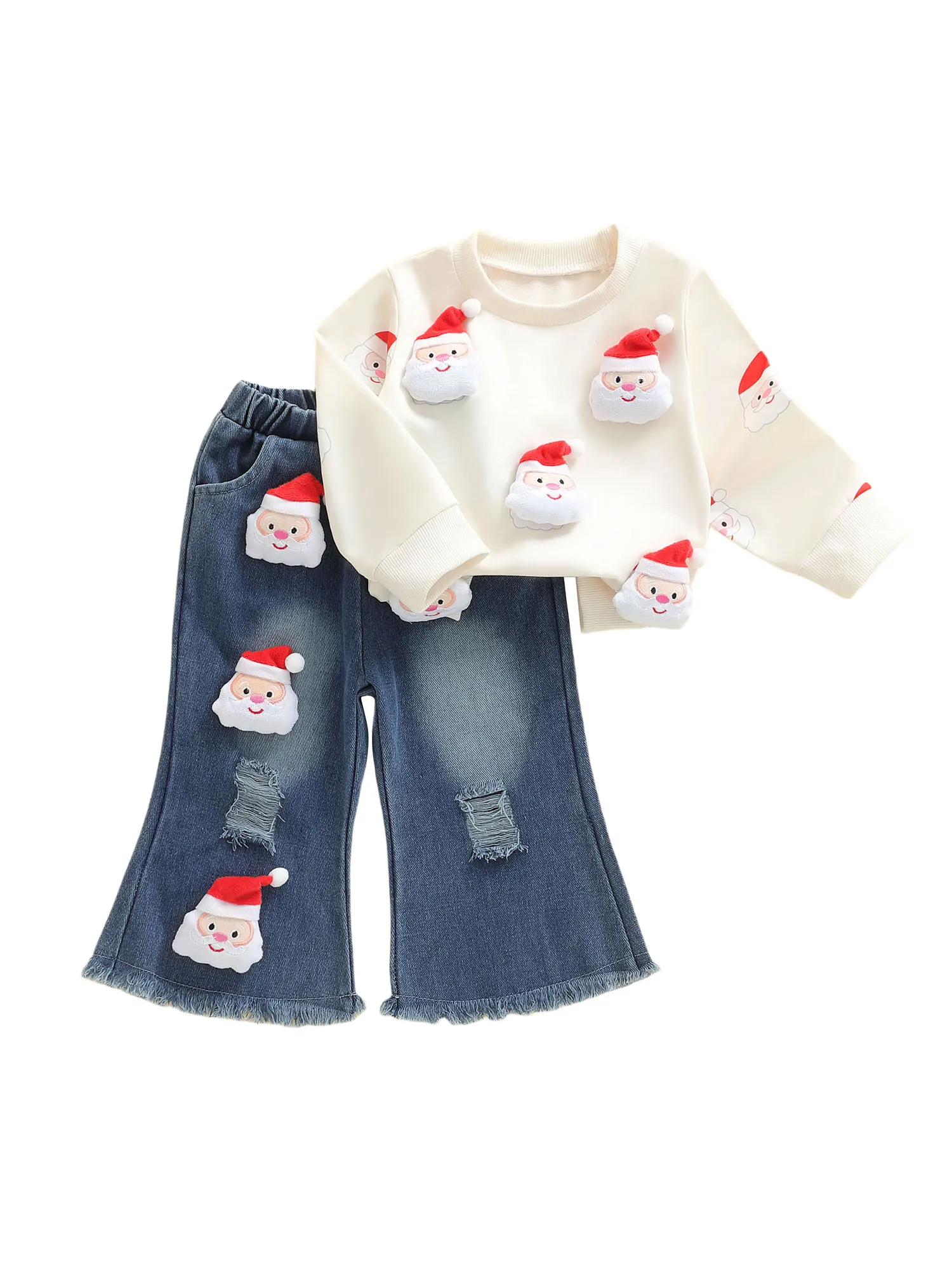 Toddler Girl Christmas Outfits 3D Santa Long Sleeve Round Neck Pullover + Elastic Waist Ripped Denim Pants 2 Pcs Set