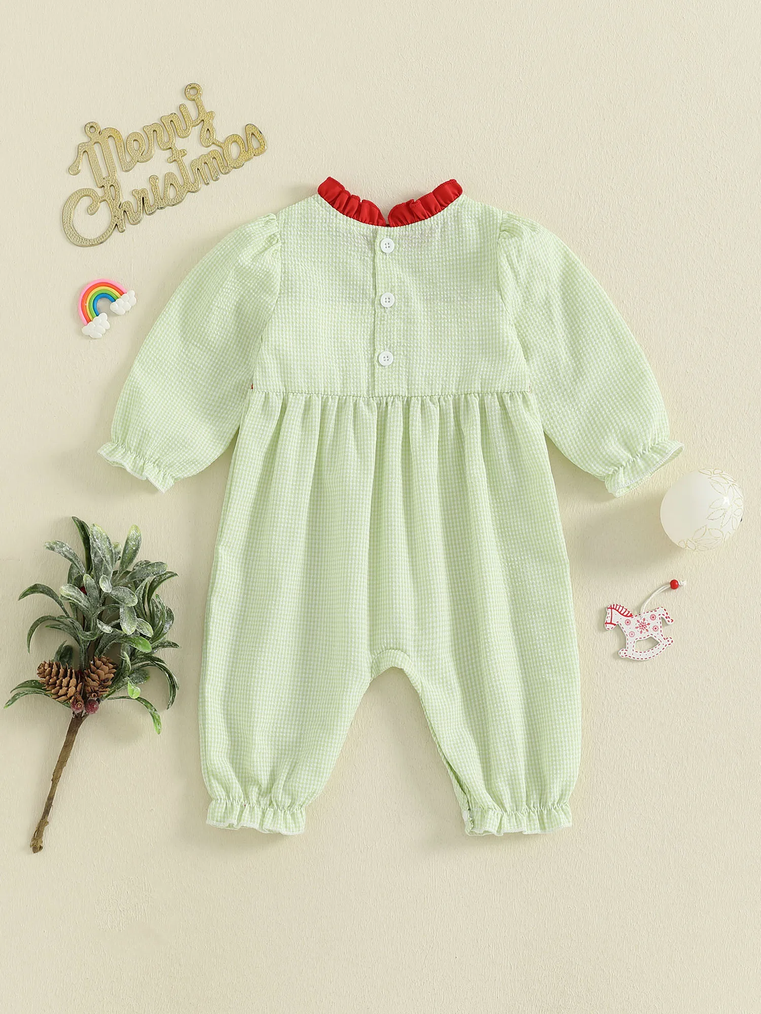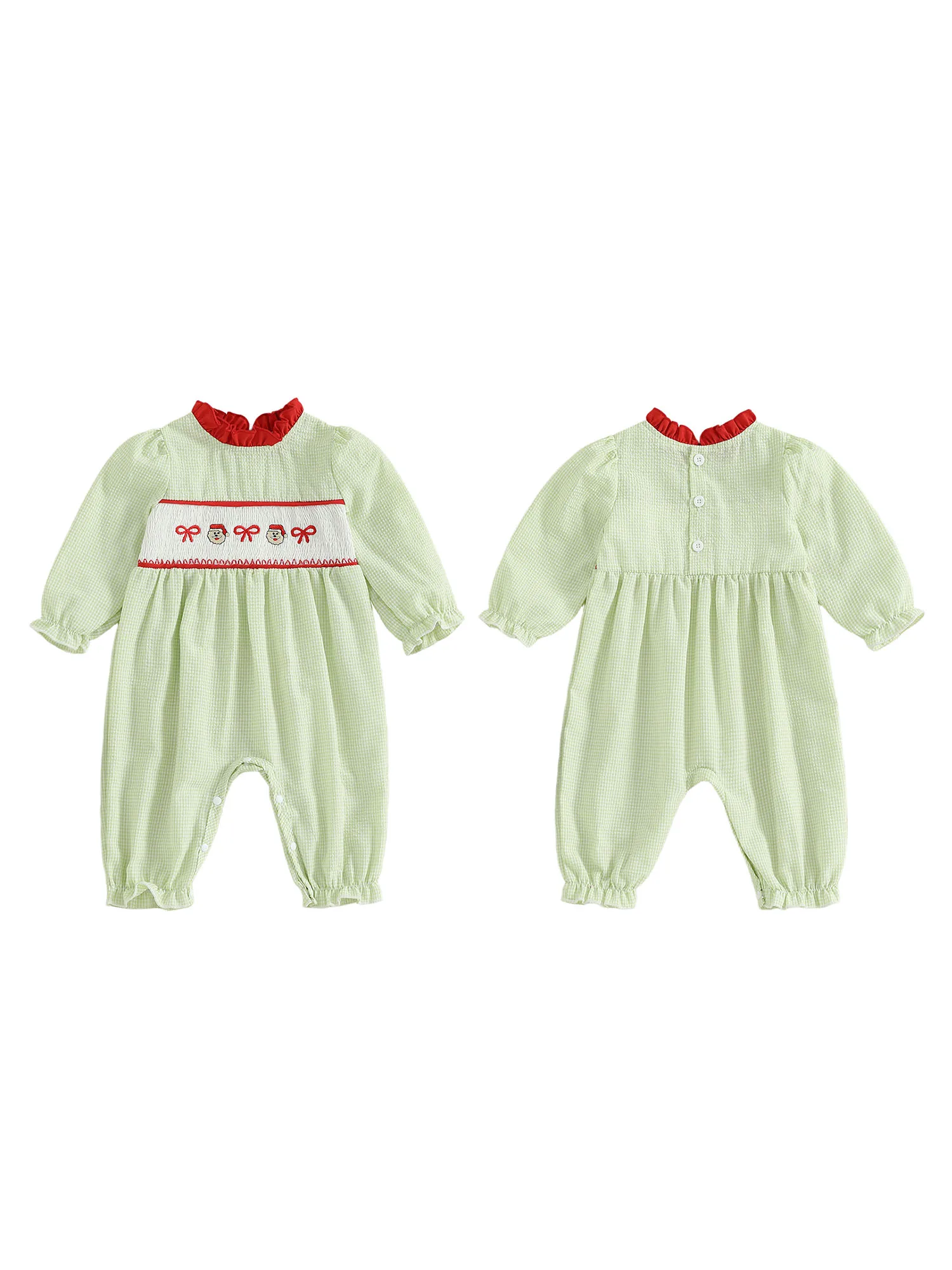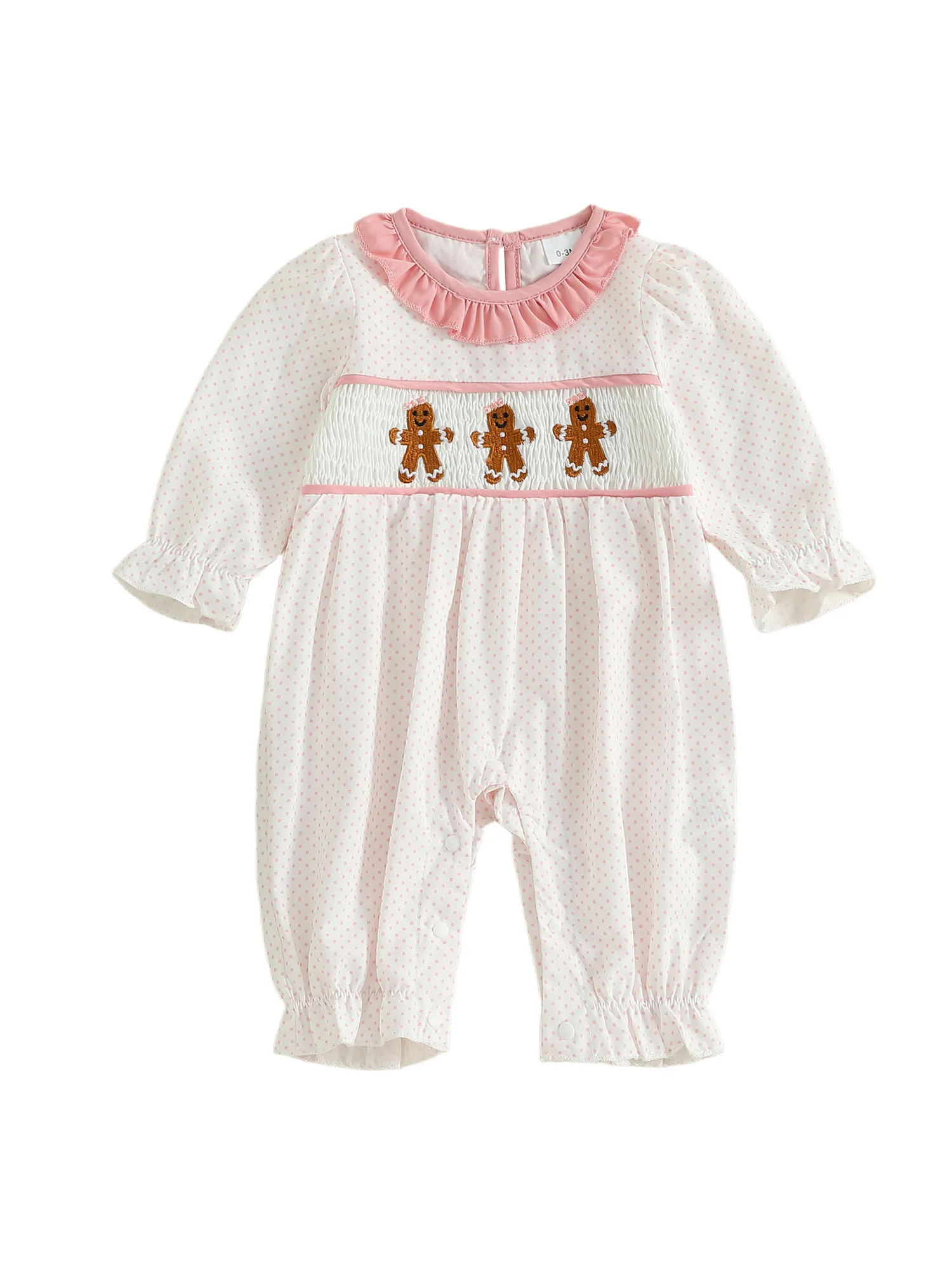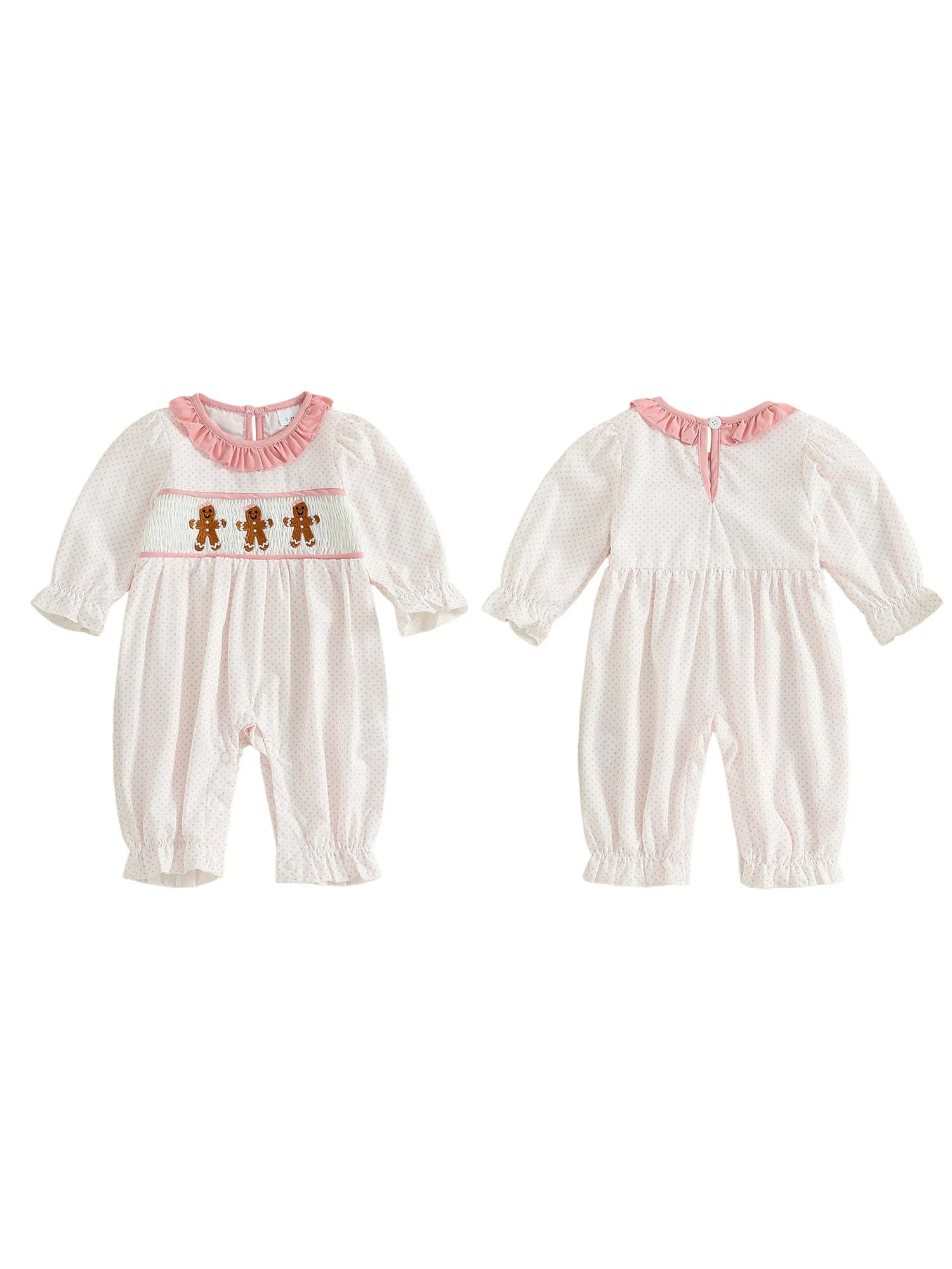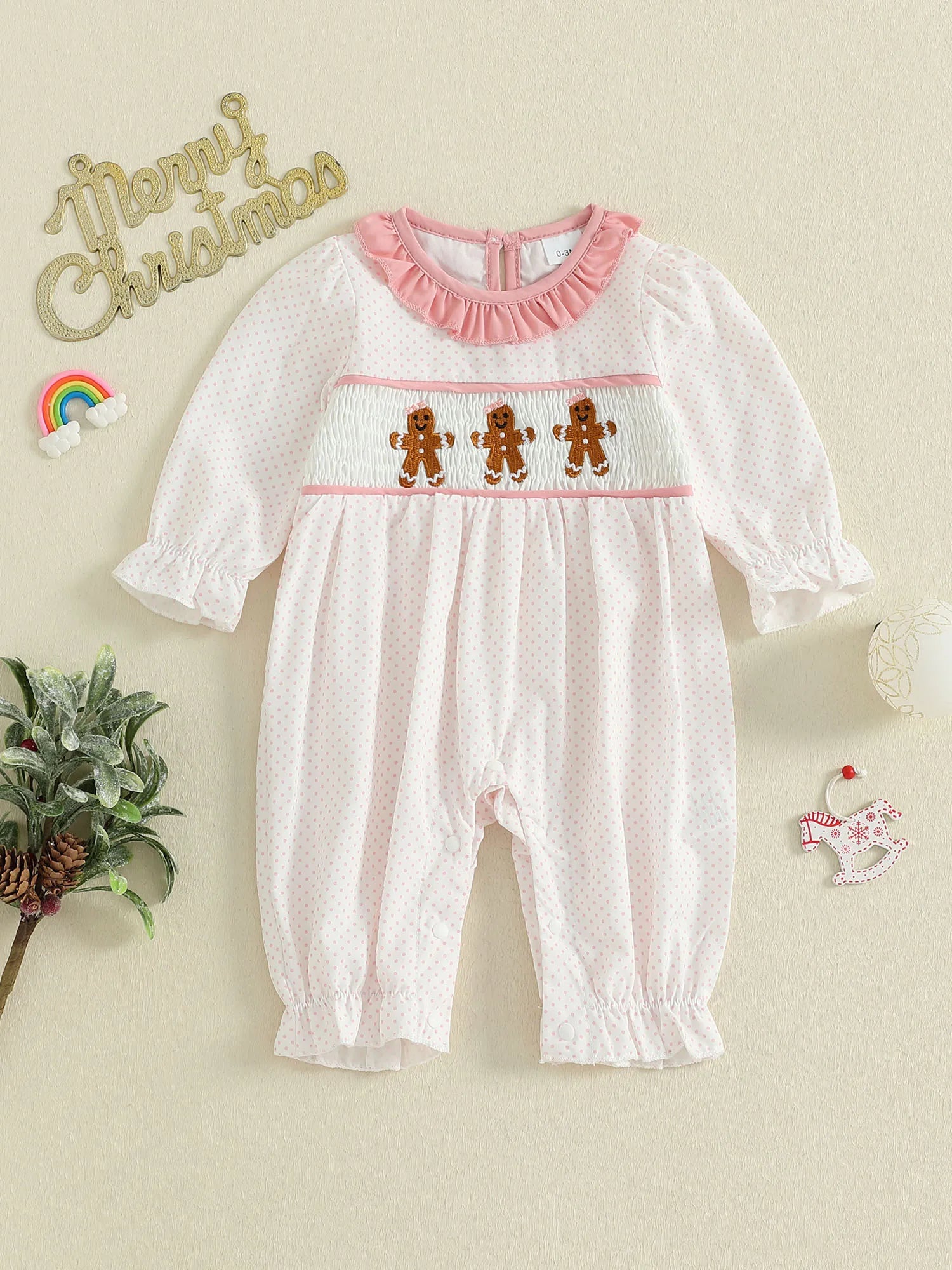 Baby Girl Bubble Romper Santa/Gingerbread Embroidery Smocked Long Sleeve Christmas Jumpsuit