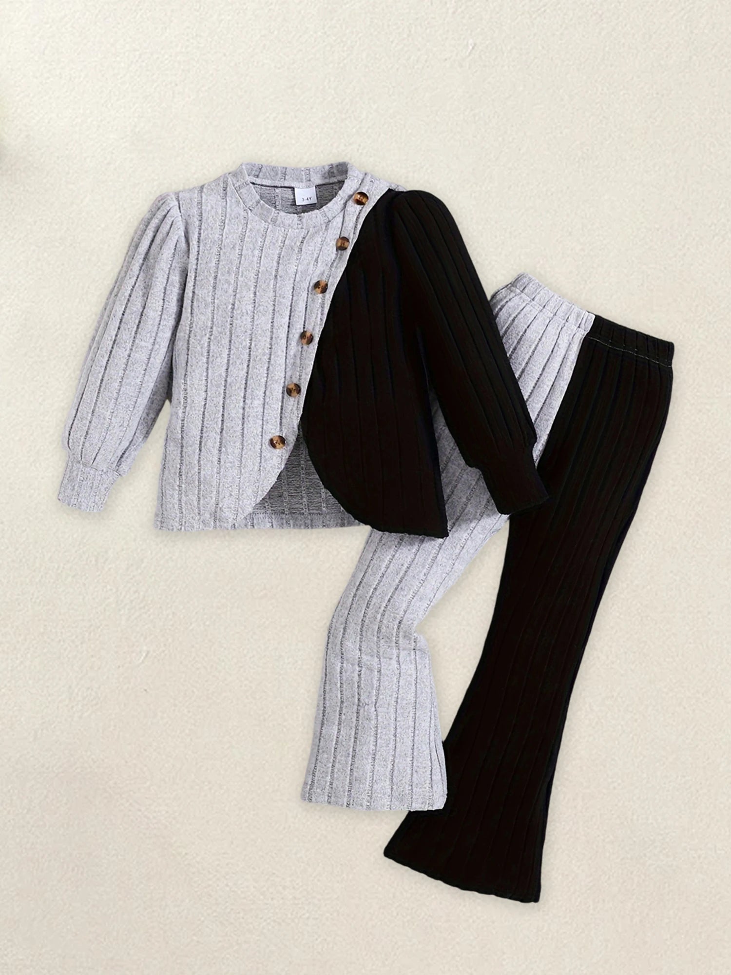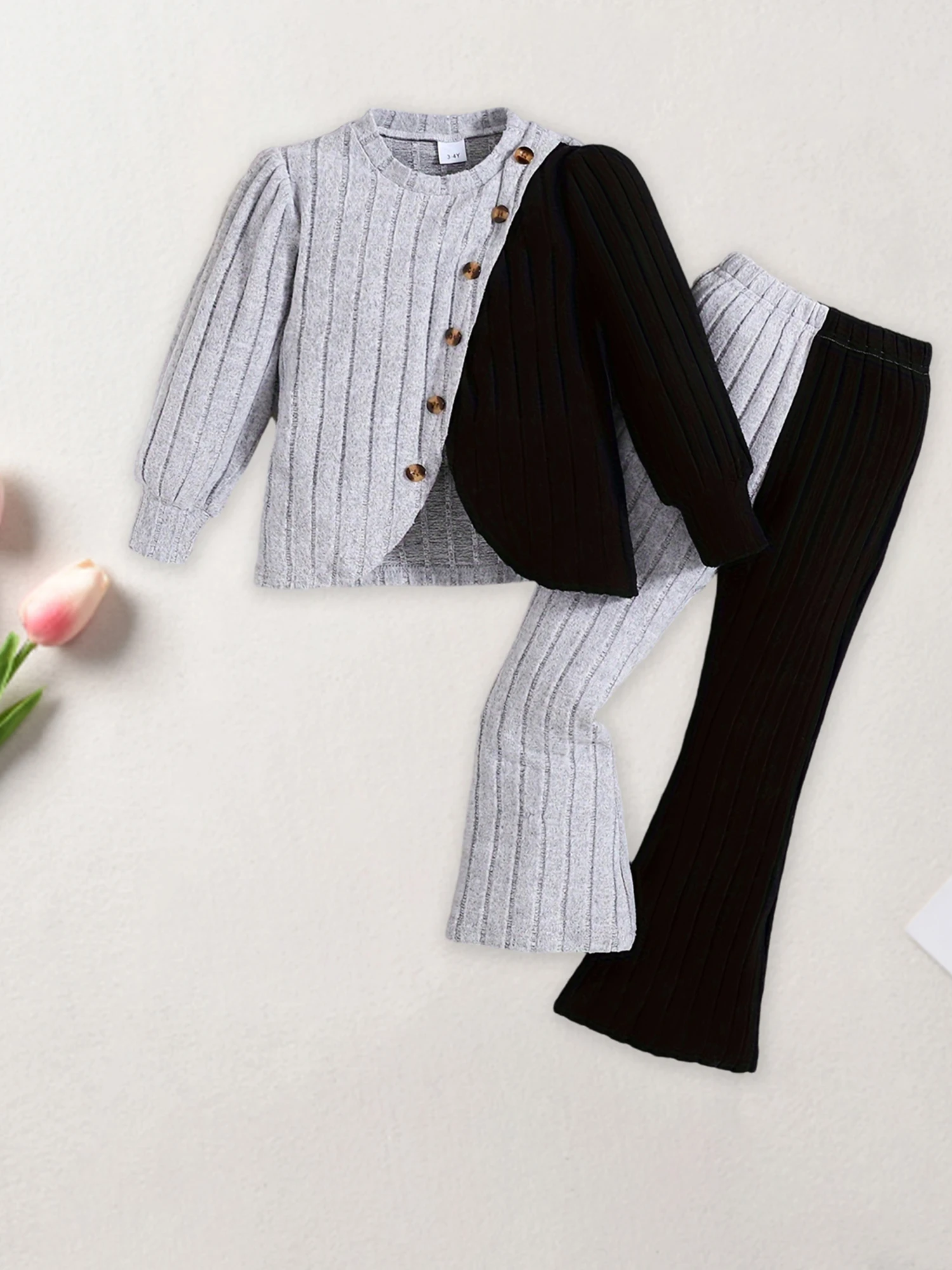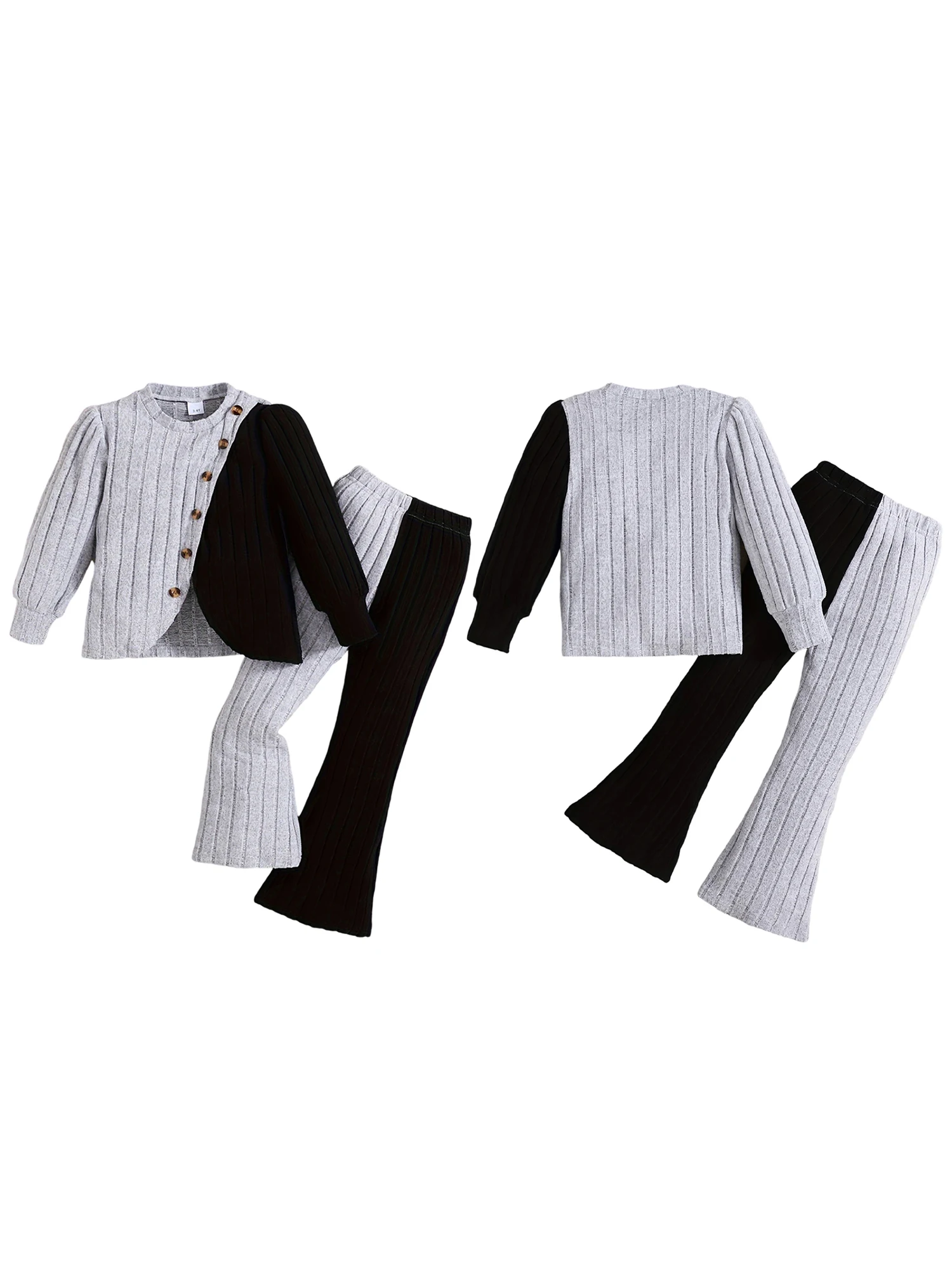 Kid Girl Fall Outfits Contrast Color Long Sleeve Round Neck Tops + Elastic Waist Flare Pants 2 Pcs Set