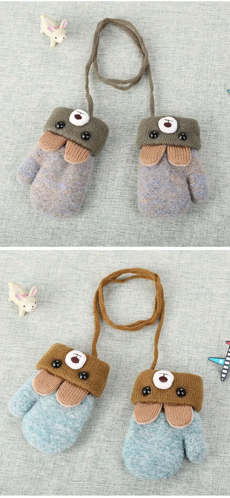 Toddler Winter Warm Knitted Gloves - Cute Bear Design Full Rope Thermal Mittens for Boys & Girls (Infant/Kids)